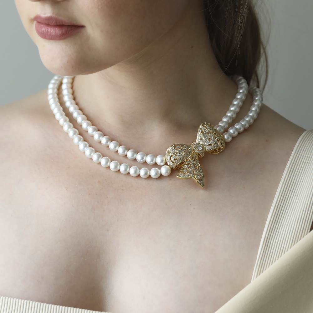 Описание: Изготовлено из ювелирного сплава на основе латуни с гальваническим покрытием золотом. Изделие украшает майорский круглый жемчуг белого цвета диаметром 8мм и фианиты. Длина колье 45см. Размер украшения 5х4см. Складной замок-пряжка.