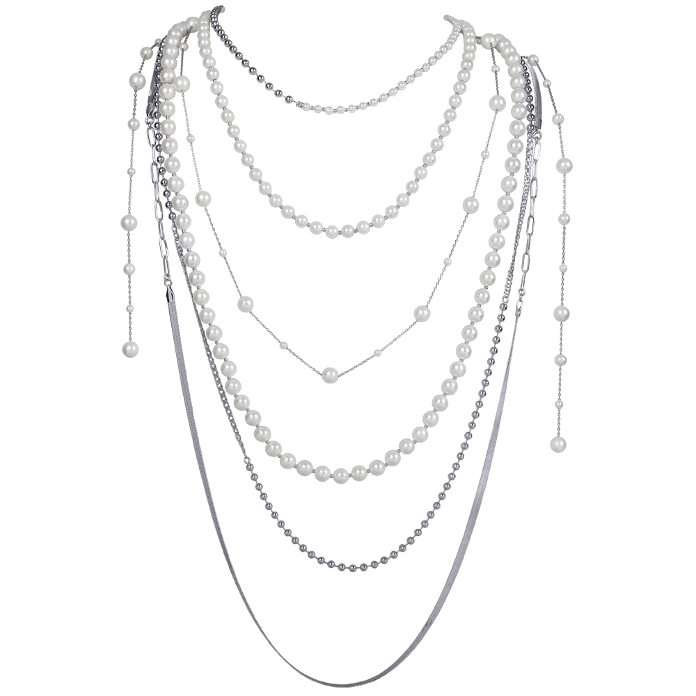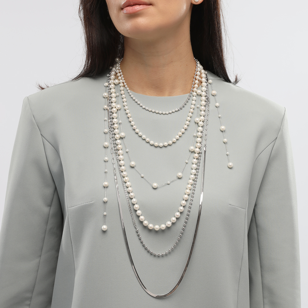 Описание: Изготовлено из ювелирного сплава на основе латуни с гальваническим покрытием родием. Колье выполнено из белого жемчуга Майорка диаметром 4-8мм. Длина 45см. Замок-карабин с удлинителем 3см.