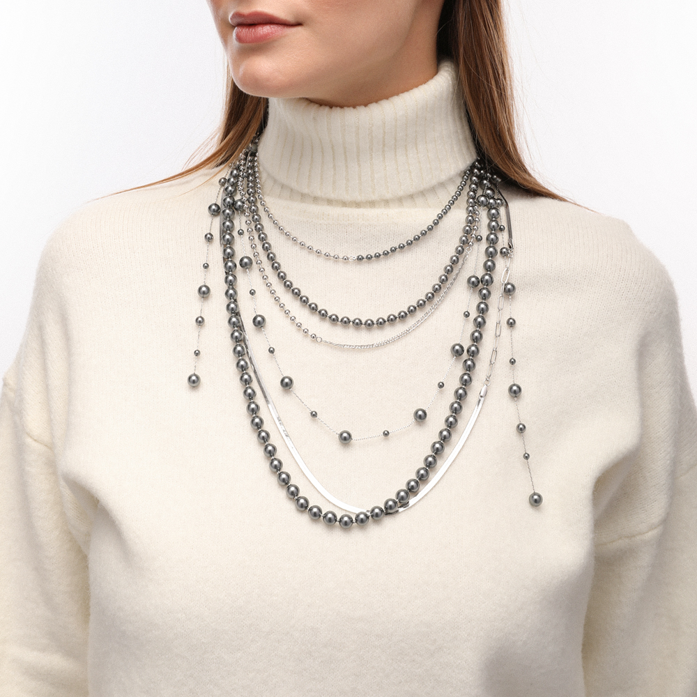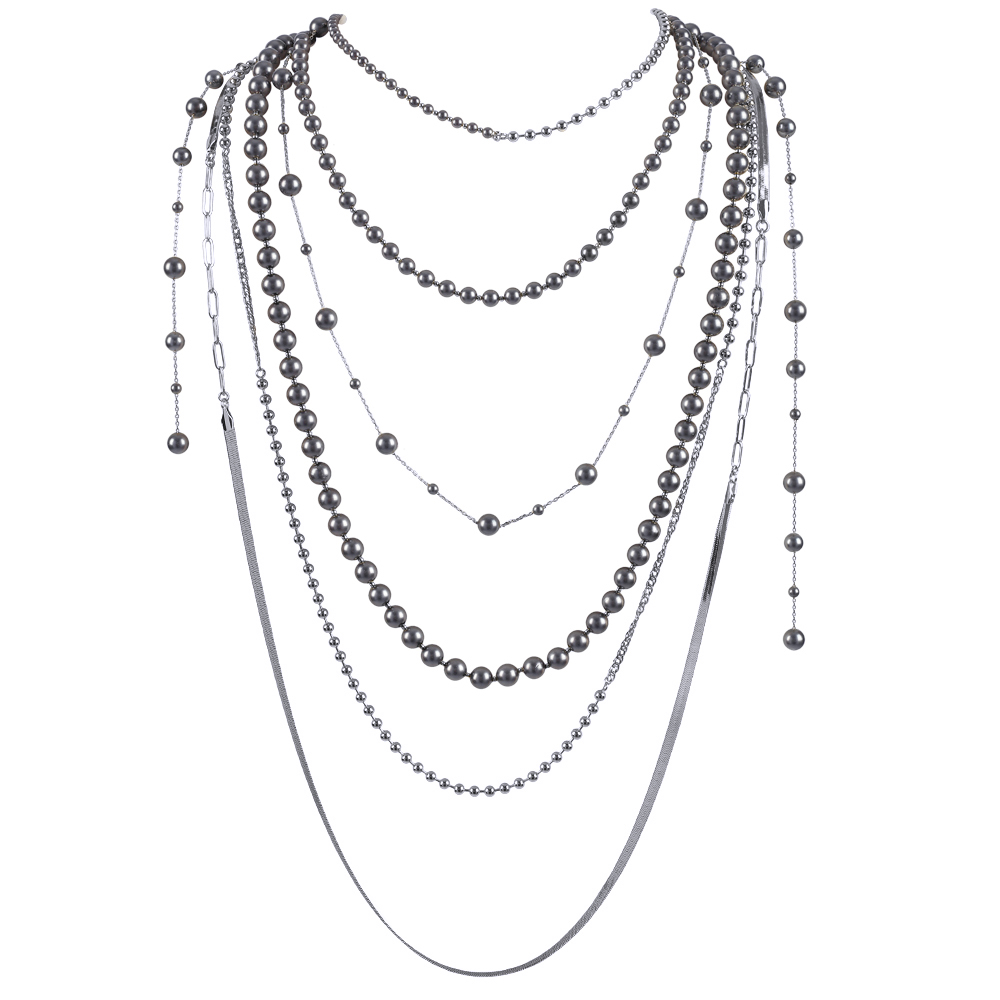 Описание: Изготовлено из ювелирного сплава на основе латуни с гальваническим покрытием родием. Колье выполнено из темно-серого жемчуга Майорка диаметром 4-8мм. Длина 45см. Замок-карабин с удлинителем 3см