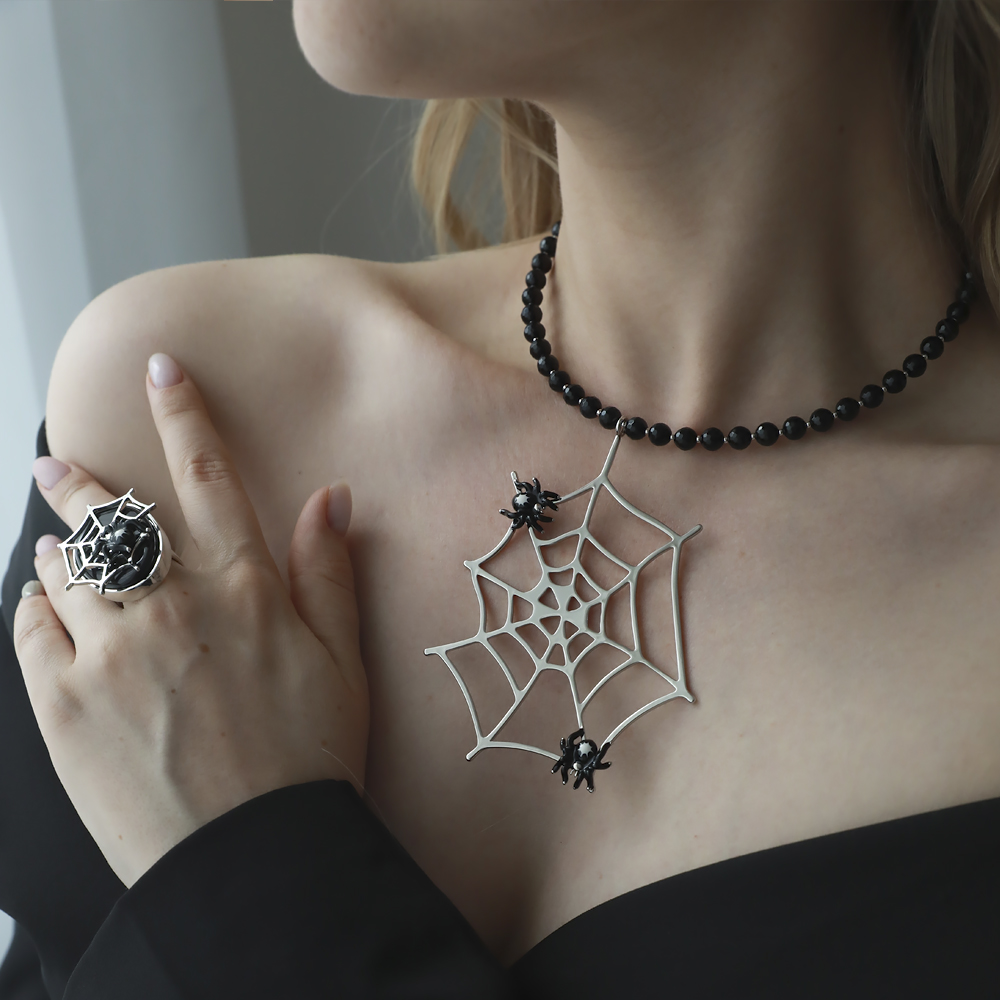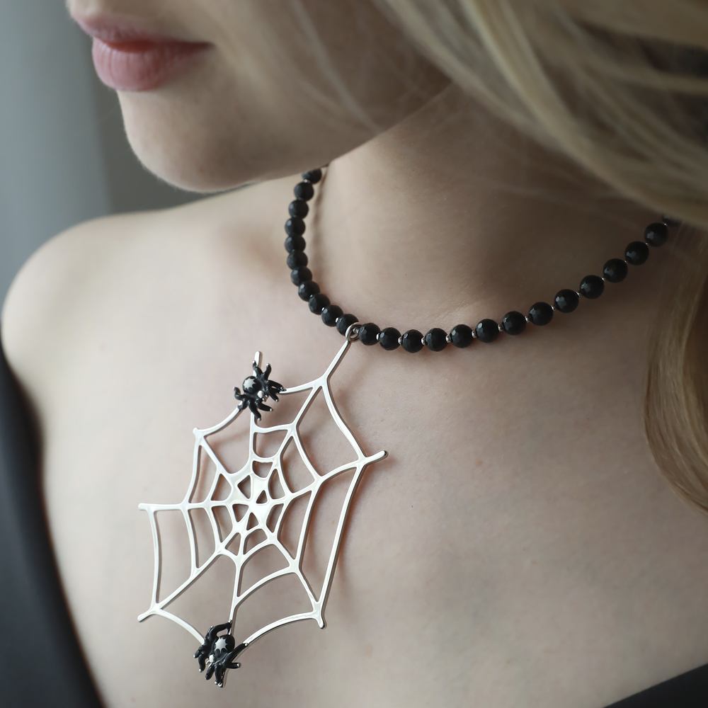 Описание: Изготовлено из ювелирного сплава на основе латуни с гальваническим покрытием родием. Изделие украшает эмаль черного и белого цвета. Длина колье на черном агате диаметром 6мм 38см. Замок-карабин с удлинителем 7см. Размер кулона 10х7см.