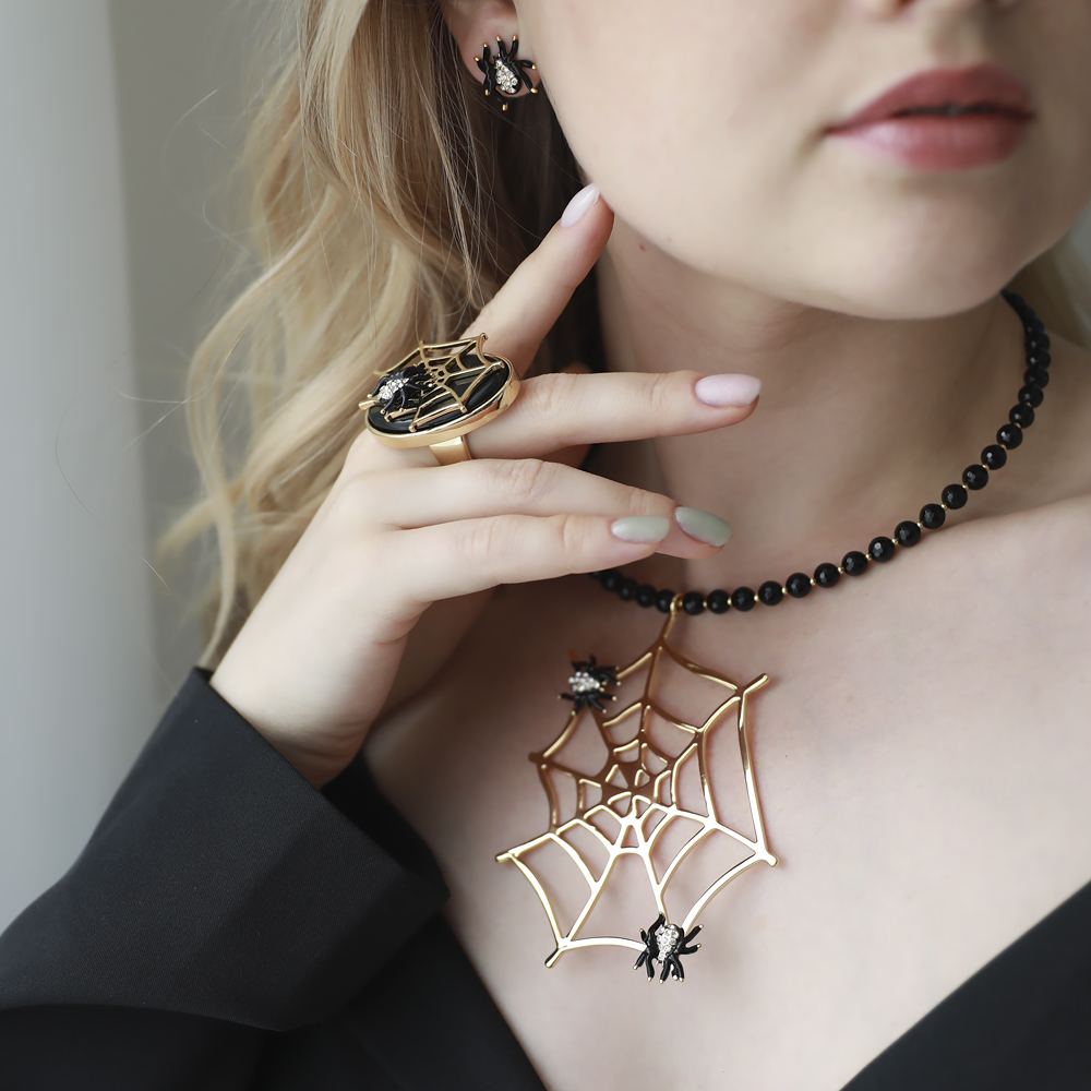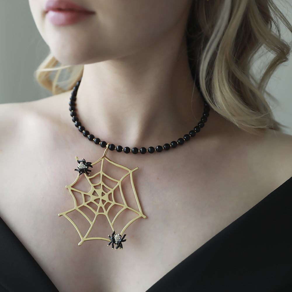 Описание: Изготовлено из ювелирного сплава на основе латуни с гальваническим покрытием золотом. Изделие украшают эмаль черного цвета и белые кристаллы SW. Длина колье на черном агате диаметром 6мм 38см. Замок-карабин с удлинителем 7см. Размер кулона 10х7см.