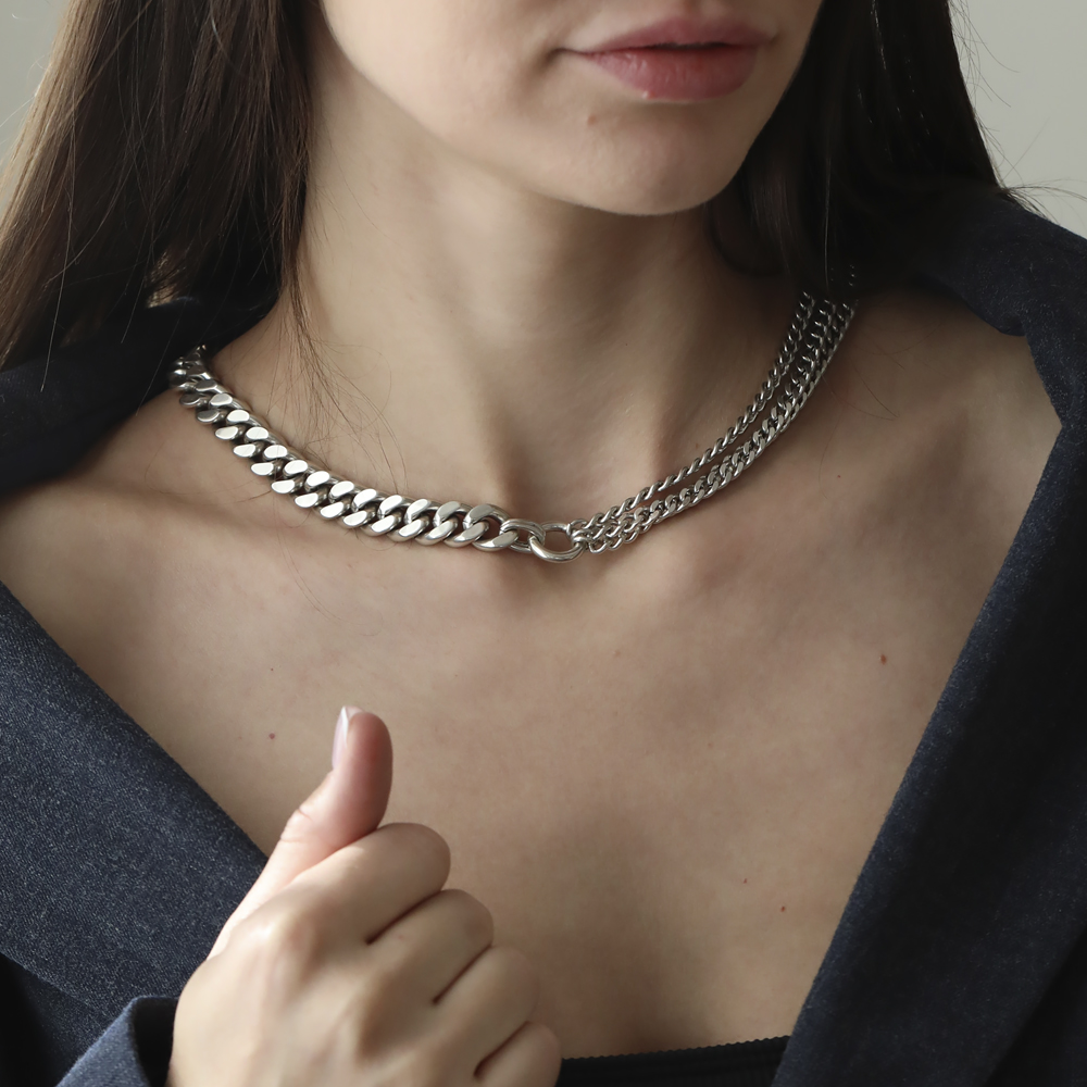 Описание: Изготовлено из ювелирного сплава на основе латуни с гальваническим покрытием античным серебром. Длина 47см. Замок-карабин с удлинителем 7см.