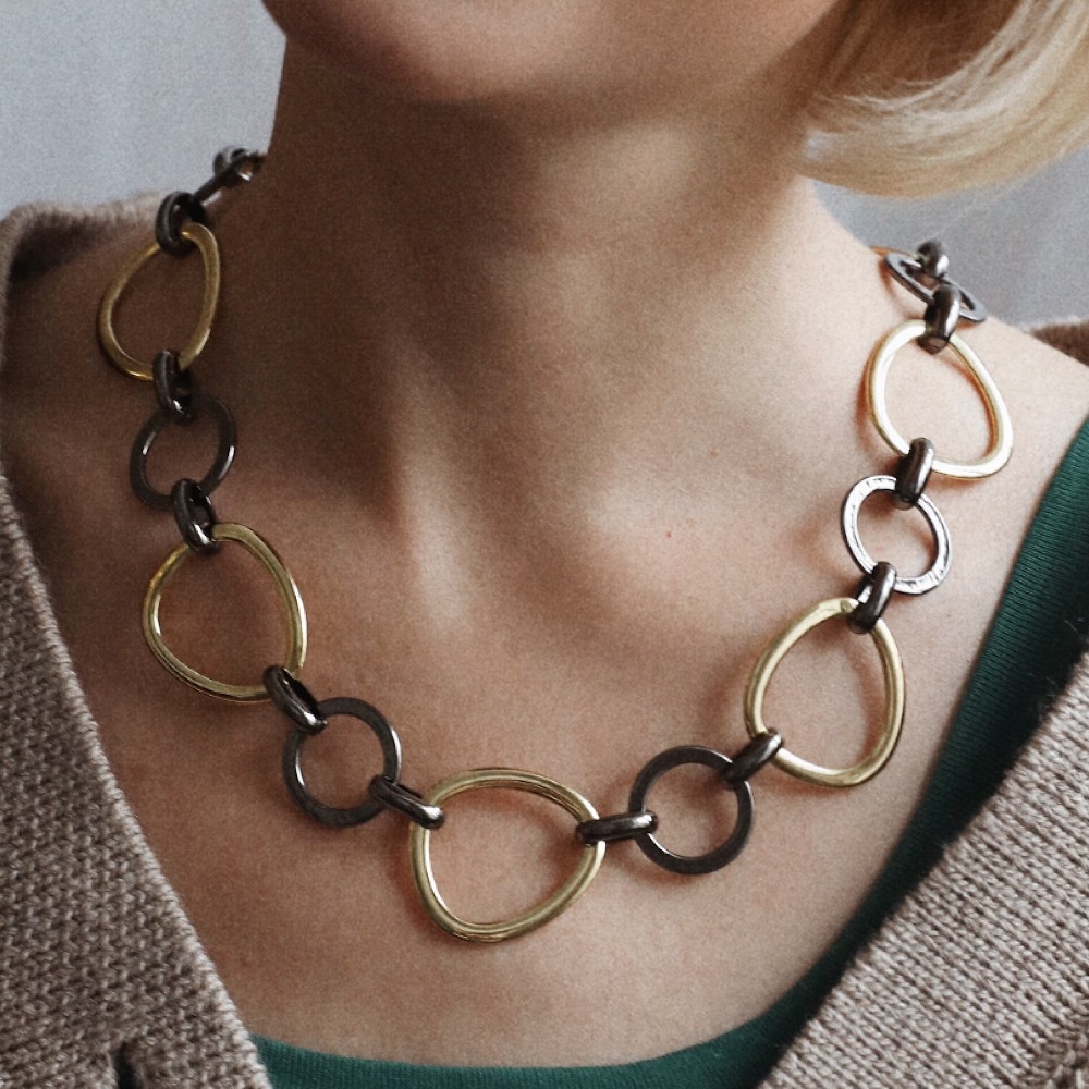 Описание: Изготовлено из ювелирного сплава на основе латуни с гальваническим покрытием золотом и черным родием. Длина колье 55см. Замок-карабин с удлинителем 5см. Ширина колье 3см.