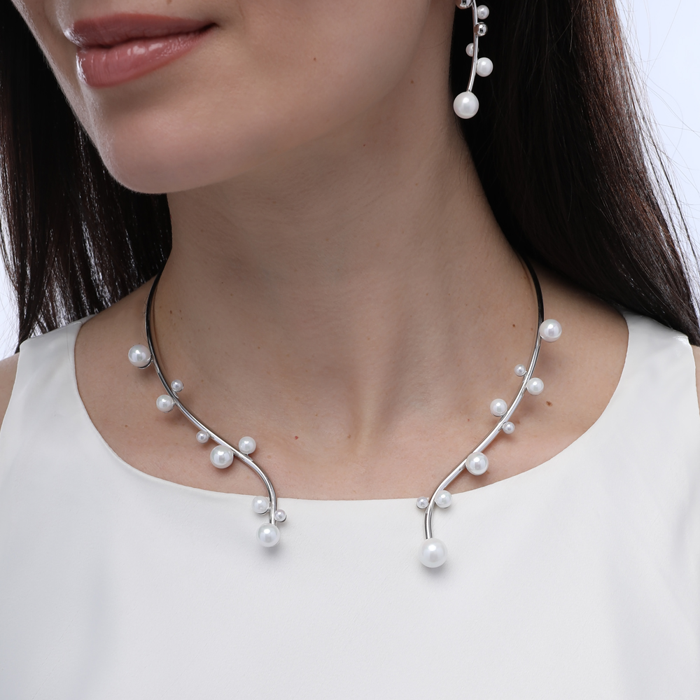 Описание: Изготовлено из ювелирного сплава на основе латуни с гальваническим покрытием родием. Изделие украшает майорский круглый жемчуг белого цвета диаметром 4-10мм.