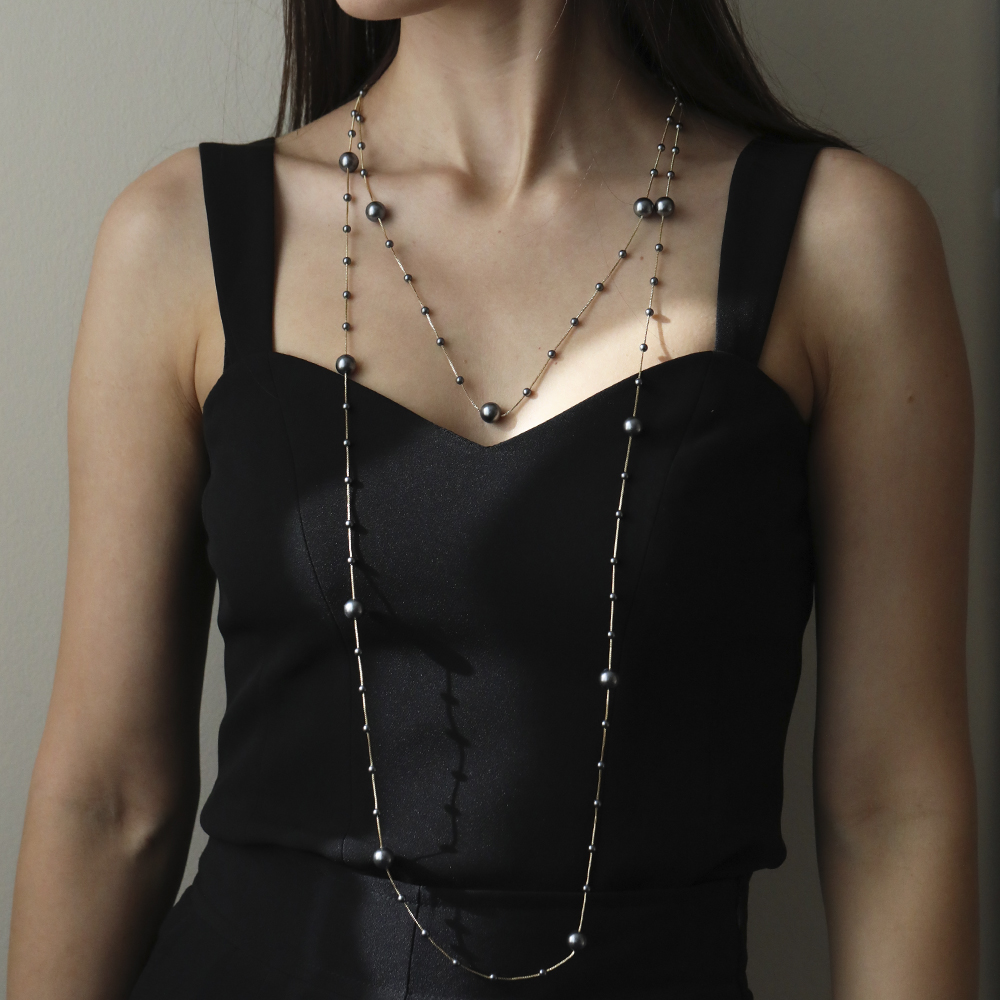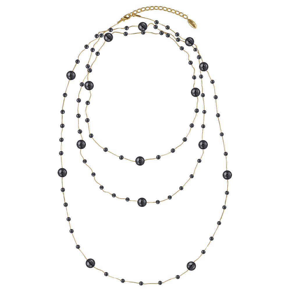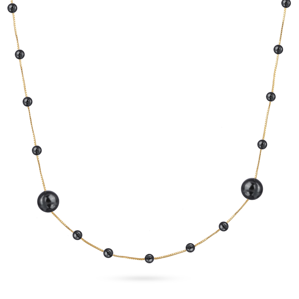 Описание: Изготовлено из ювелирного сплава на основе латуни с гальваническим покрытием золотом. Изделие украшает майорка диаметром 5-10мм темно-серого цвета. Длина колье 190см.