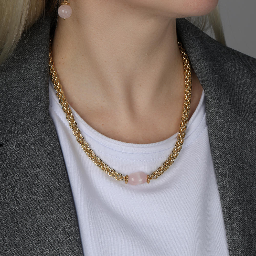 Описание: Изготовлено из ювелирного сплава на основе латуни с гальваническим покрытием родием. Изделие украшает розовый кварц диаметром 15мм. Длина колье 42см. Замок-карабин с удлинителем 5см.