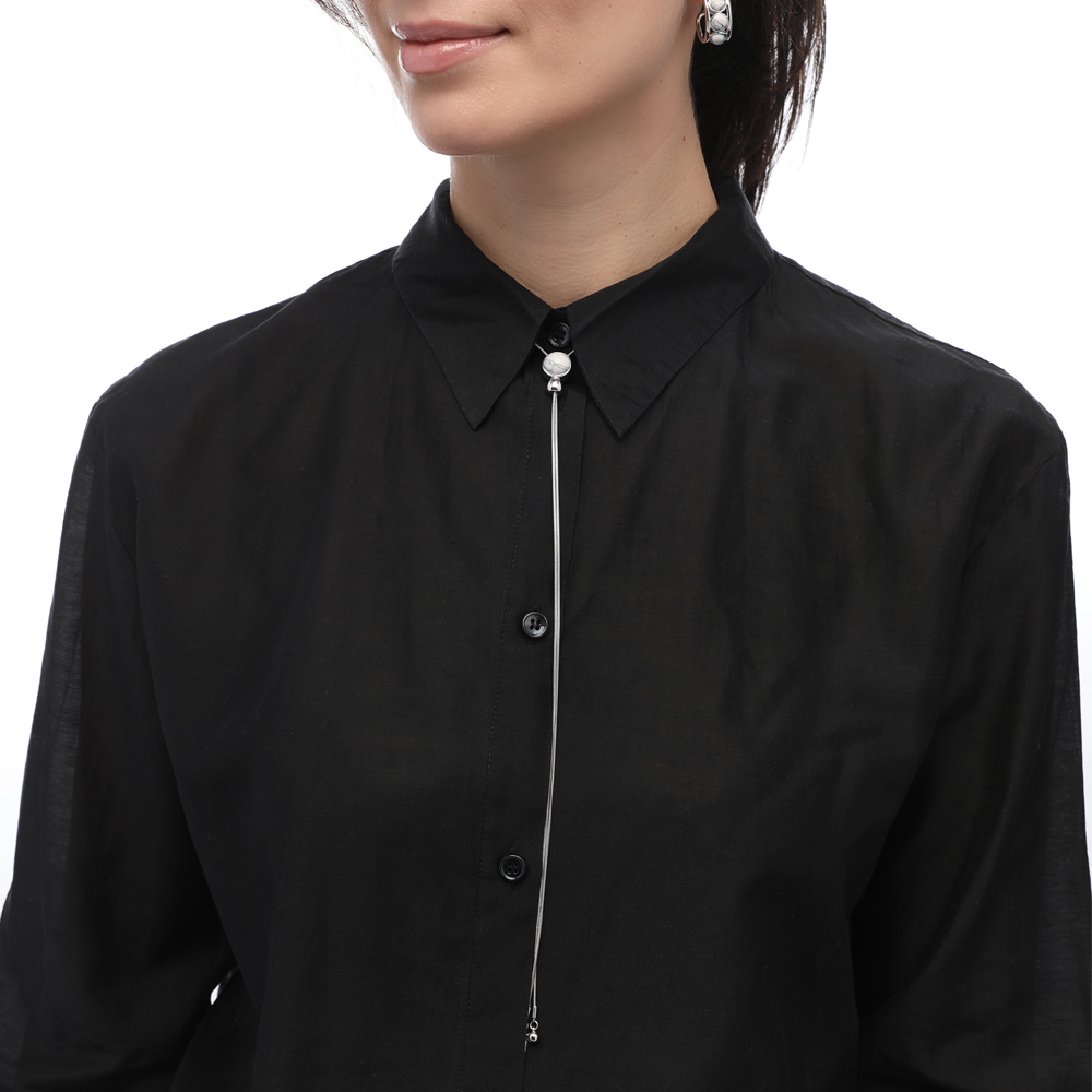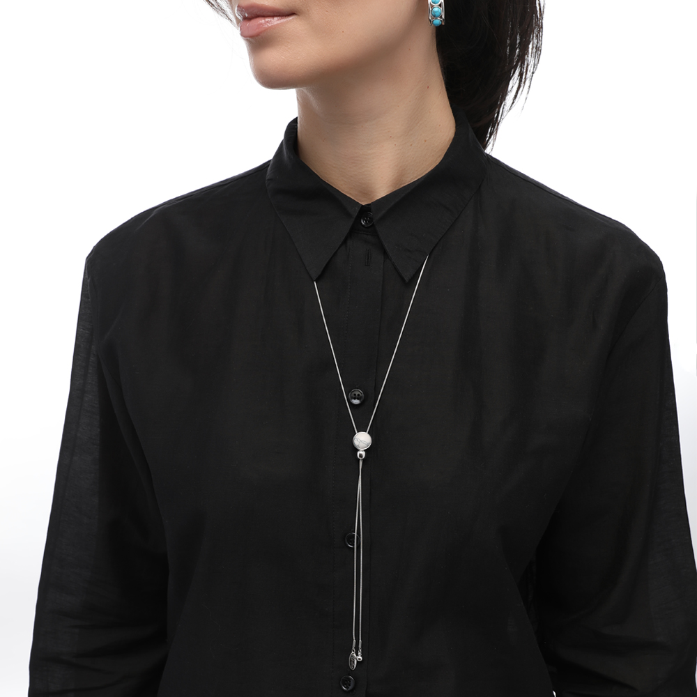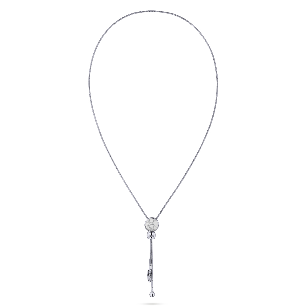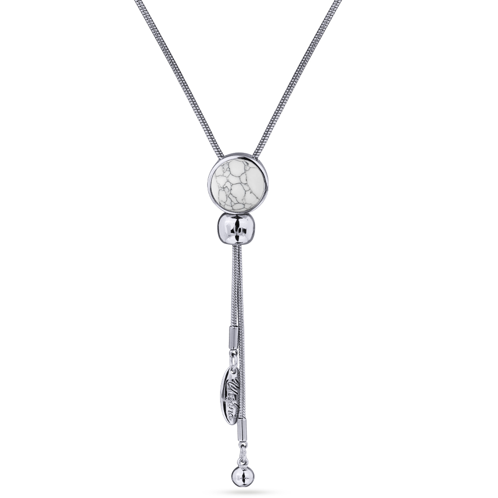 Описание: Изготовлено из ювелирного сплава на основе латуни с гальваническим покрытием родием. Изделие украшает белая бирюза. Длина колье 90см. На цепочке установлен бегунок регулировки длины.