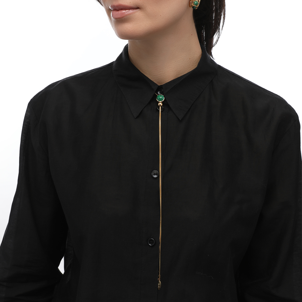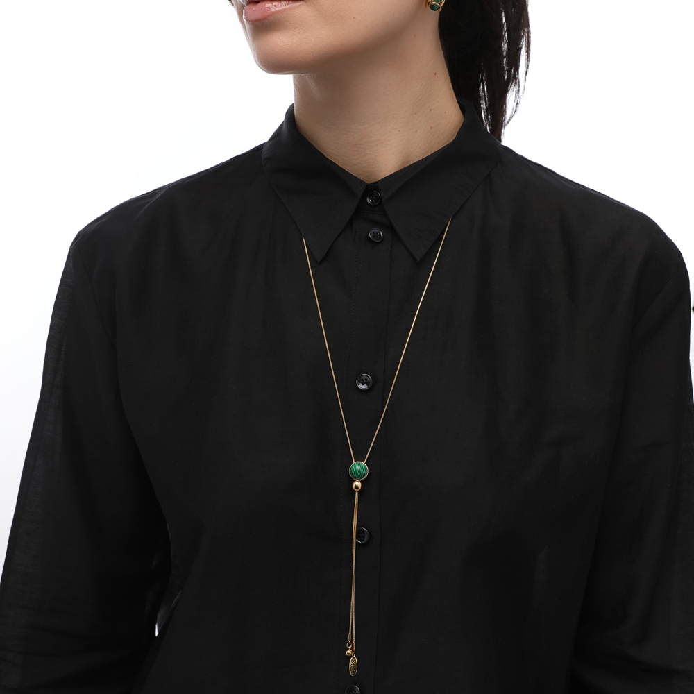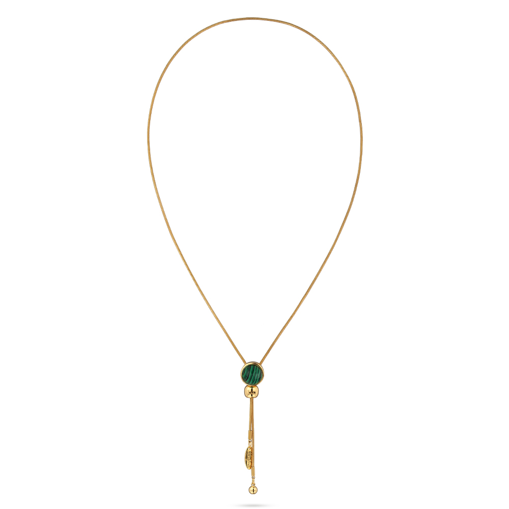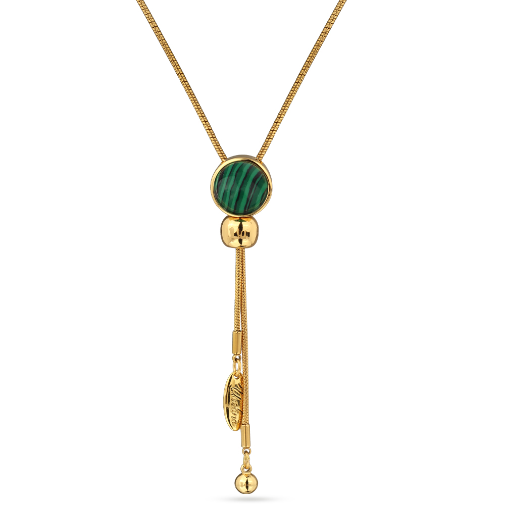 Описание: Изготовлено из ювелирного сплава на основе латуни с гальваническим покрытием золотом. Изделие украшает малахит. Длина колье 90см. На цепочке установлен бегунок регулировки длины.