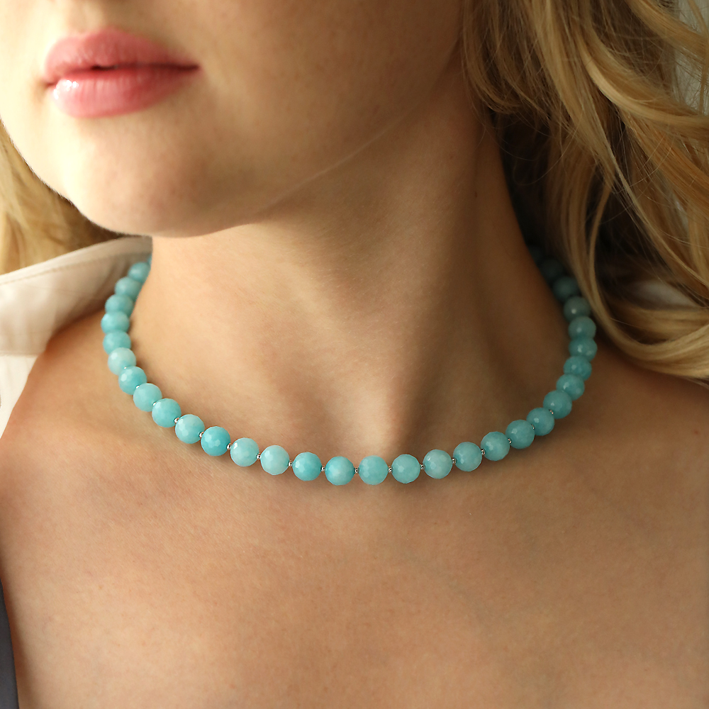 Описание: Изготовлено из ювелирного сплава на основе латуни с гальваническим покрытием родием. Изделие украшает агат небесного цвета диаметром 8мм. Длина 40см. Замок-карабин с удлинителем 5см.