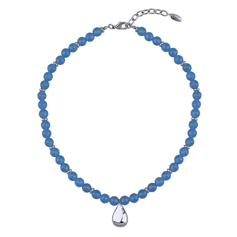 Описание: Изготовлено из ювелирного сплава на основе латуни с гальваническим покрытием родием. Изделие украшает натуральный васильковый агат диаметром 8мм. Длина 46см. Замок-карабин с удлинителем 6см. Размер кулона 2х1.4см.