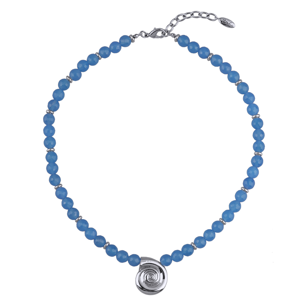 Описание: Изготовлено из ювелирного сплава на основе латуни с гальваническим покрытием родием. Изделие украшает натуральный васильковый агат диаметром мм. Длина 45см. Замок-карабин с удлинителем 7см. Размер кулона 2.4х2.2см.