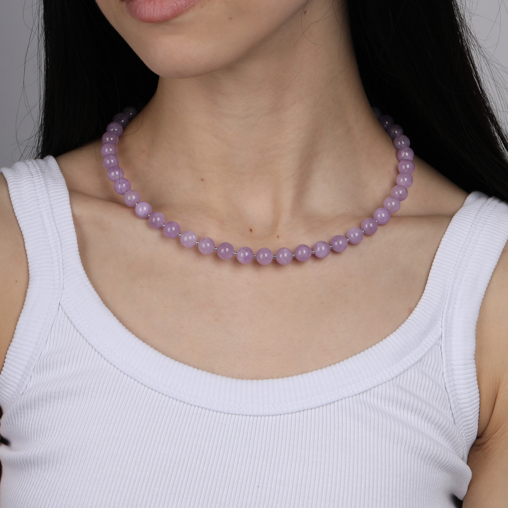 Описание: Изготовлено из ювелирного сплава на основе латуни с гальваническим покрытием родием. Изделие украшает аметист диаметром 8мм. Длина 40см. Замок-карабин с удлинителем 5см.