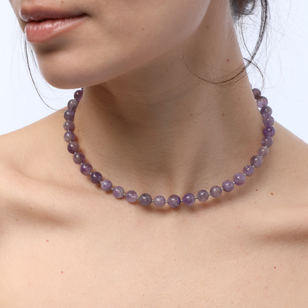 Описание: Изготовлено из ювелирного сплава на основе латуни с гальваническим покрытием родием. Изделие украшает аметист темно-фиолетового цвета диаметром 8мм. Длина 40см. Замок-карабин с удлинителем 5см.