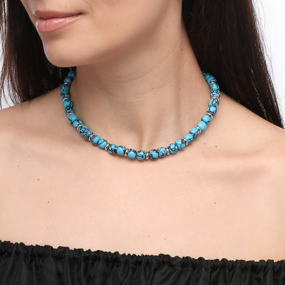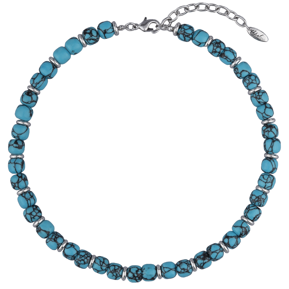 Описание: Изготовлено из ювелирного сплава на основе латуни с гальваническим покрытием родием. Изделие украшает натуральный голубой говлит диаметром 8мм. Длина 40см. Замок-карабин с удлинителем 5см.