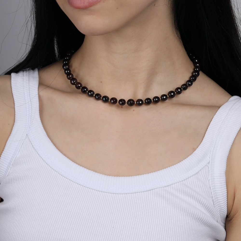 Описание: Изготовлено из ювелирного сплава на основе латуни с гальваническим покрытием золотом. Изделие украшает гранат диаметром 8мм. Длина 40см. Замок-карабин с удлинителем 5см.