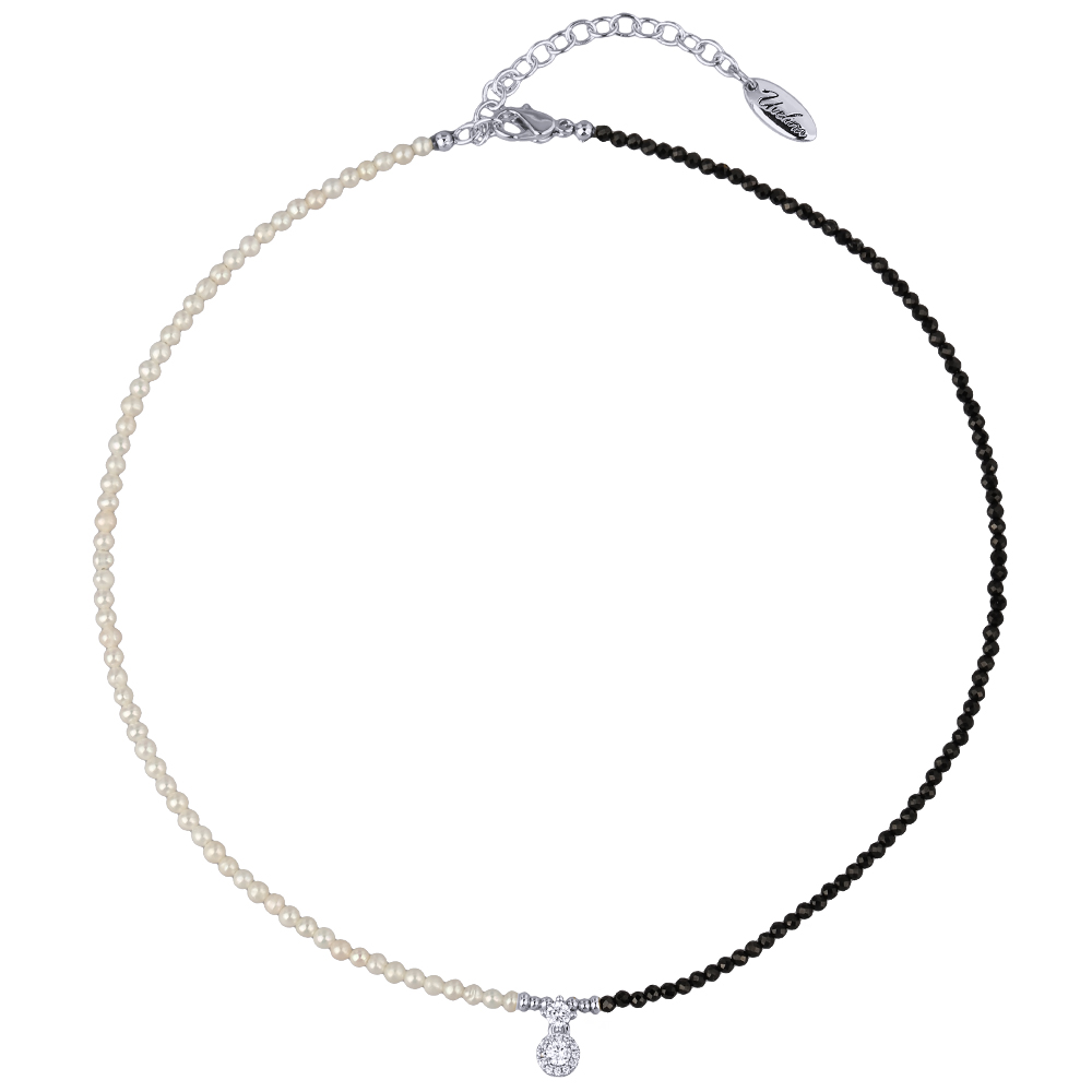 Описание: Изготовлено из ювелирного сплава на основе латуни с гальваническим покрытием родием. Изделие украшают черный шпинель, жемчуг диаметром 3мм белого цвета и белые кристаллы. Длина 40см. Замок-карабин с удлинителем 5см.