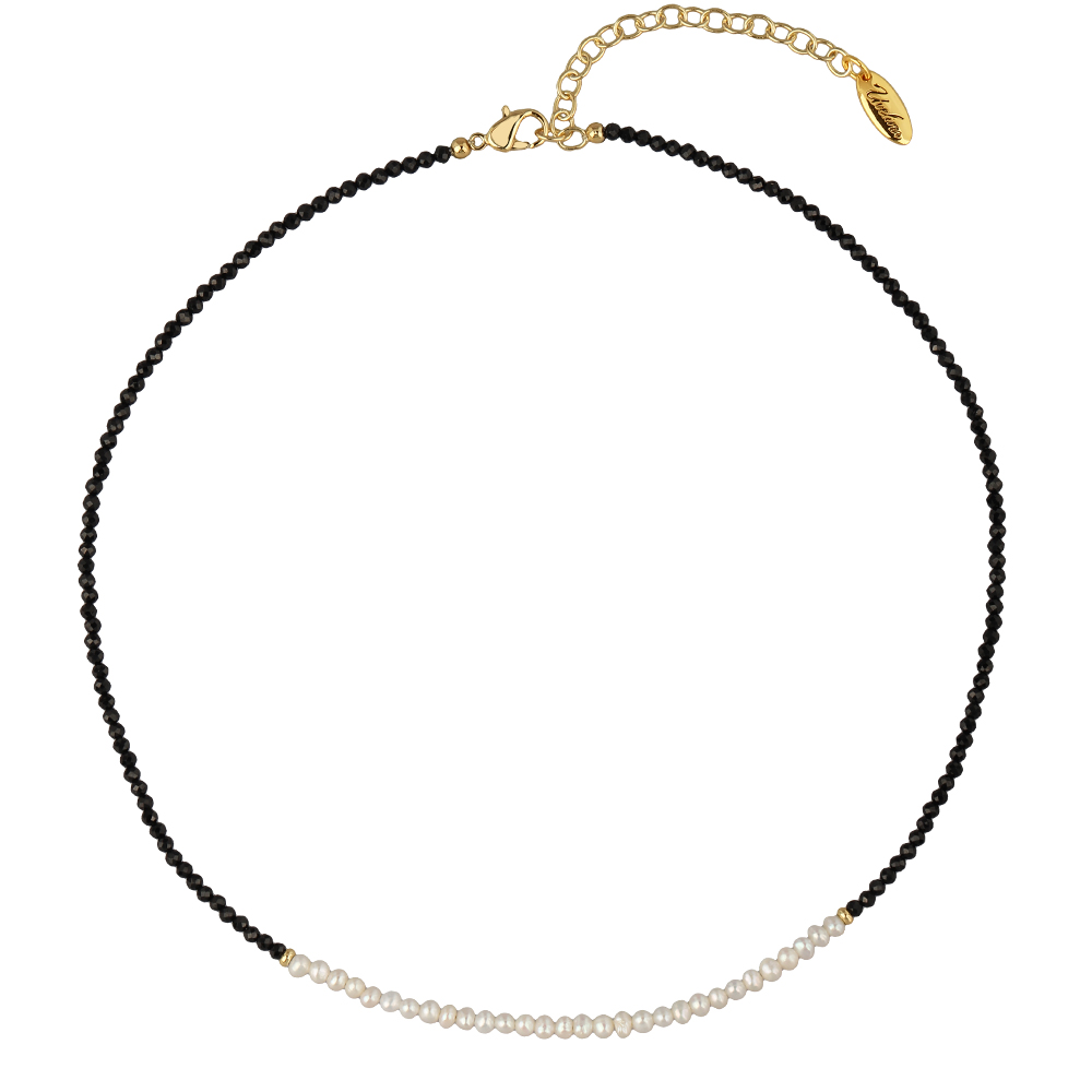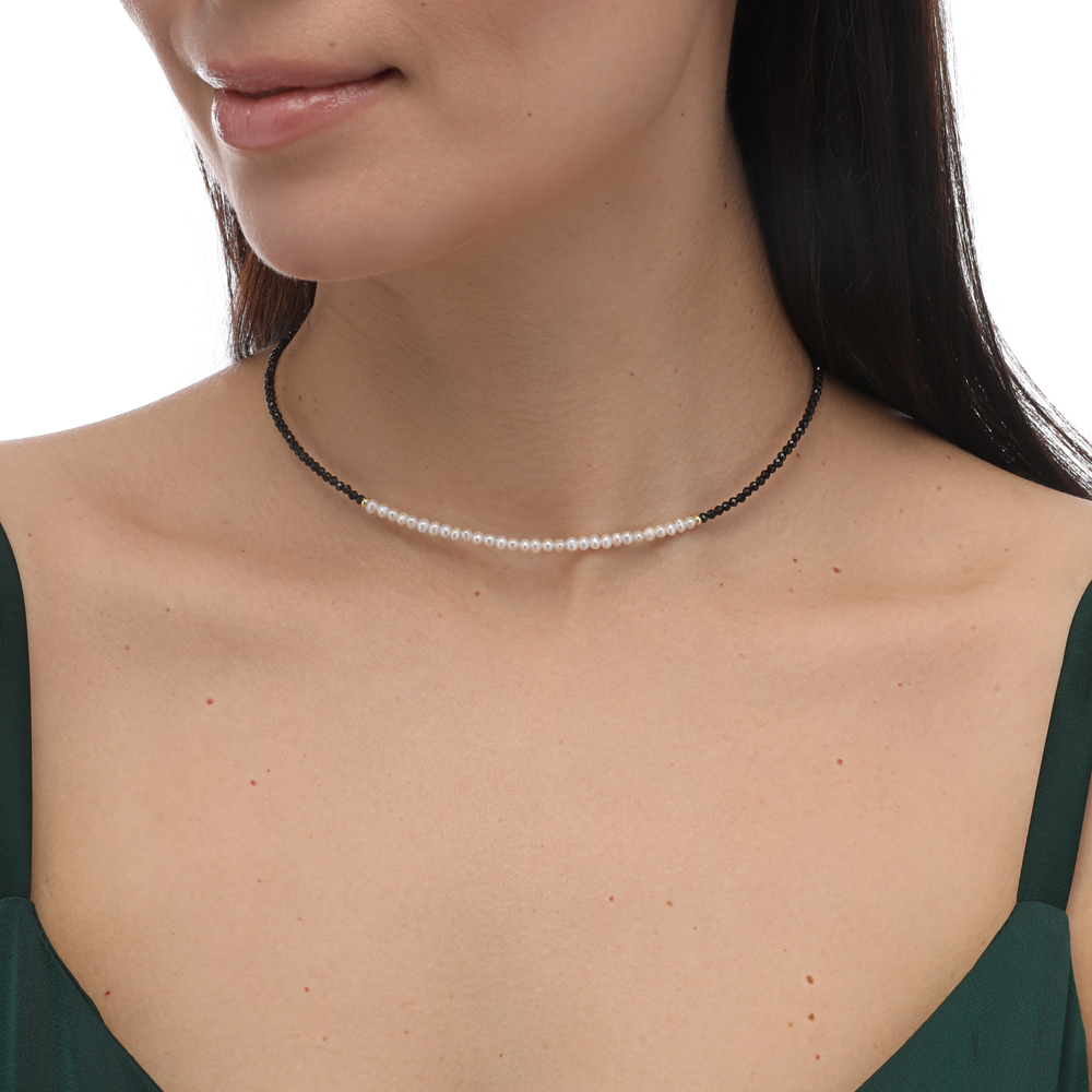 Описание: Изготовлено из ювелирного сплава на основе латуни с гальваническим покрытием золотом. Изделие украшают черная шпинель и жемчуг диаметром 3-5мм белого цвета. Длина 40см. Замок-карабин с удлинителем 5см.