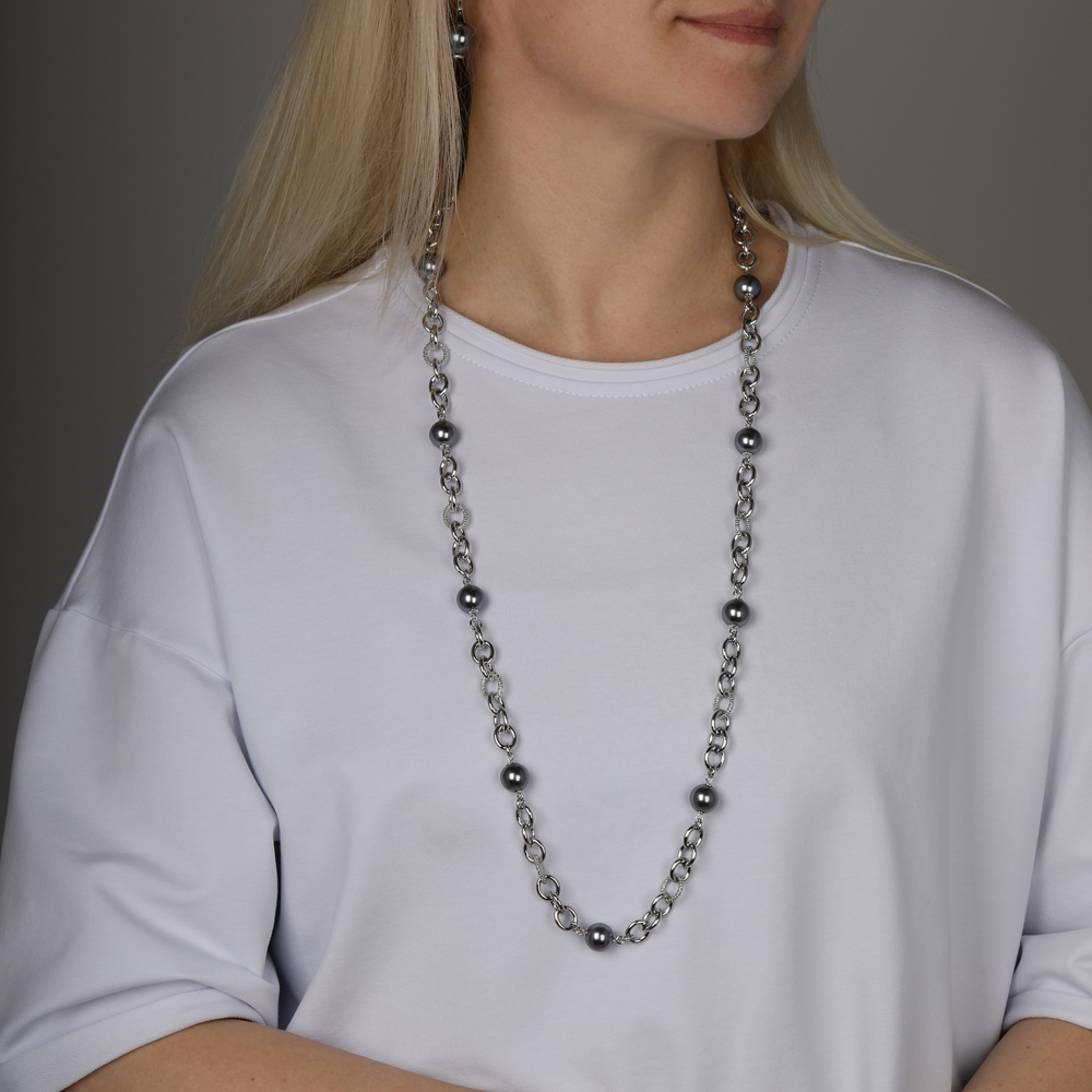 Описание: Изготовлено из ювелирного сплава на основе латуни с гальваническим покрытием родием. Изделие украшает майорский круглый жемчуг темно-серого цвета диаметром 12мм. Длина колье 77см. Застёжка в форме якоря с удлинителем 13см.