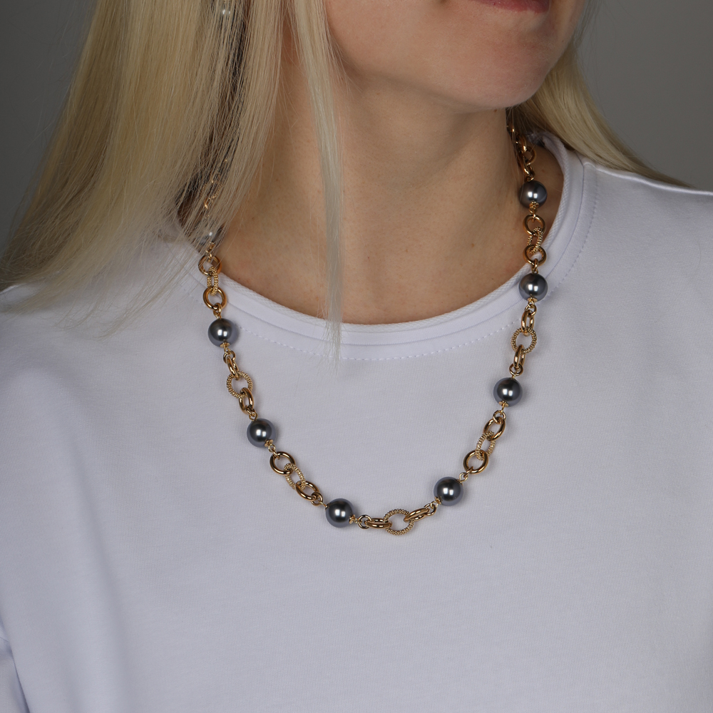 Описание: Изготовлено из ювелирного сплава на основе латуни с гальваническим покрытием золотом. Изделие украшает майорский круглый жемчуг темно-серого цвета диаметром 12мм. Длина колье 50см. Застёжка в форме якоря с удлинителем 10см.