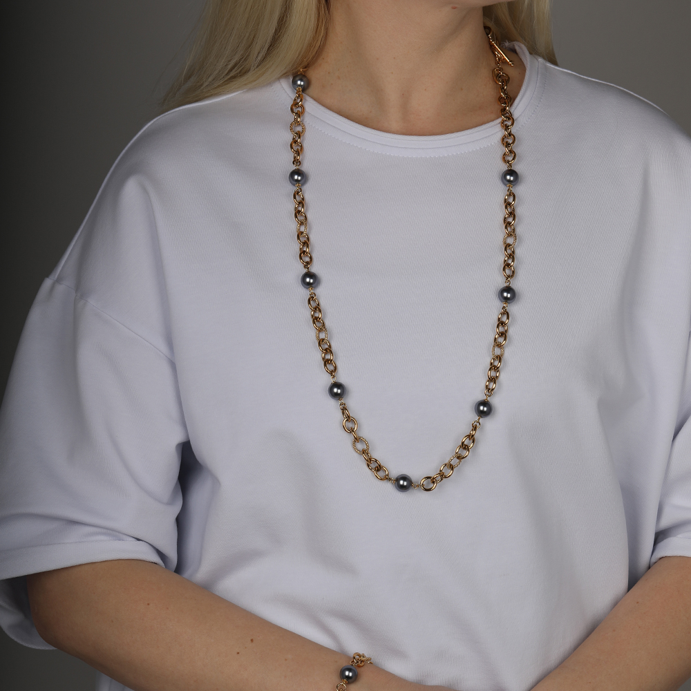 Описание: Изготовлено из ювелирного сплава на основе латуни с гальваническим покрытием золотом. Изделие украшает майорский круглый жемчуг темно-серого цвета диаметром 12мм. Длина колье 77см. Застёжка в форме якоря с удлинителем 13см.