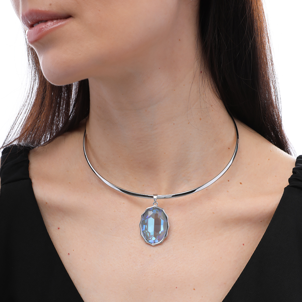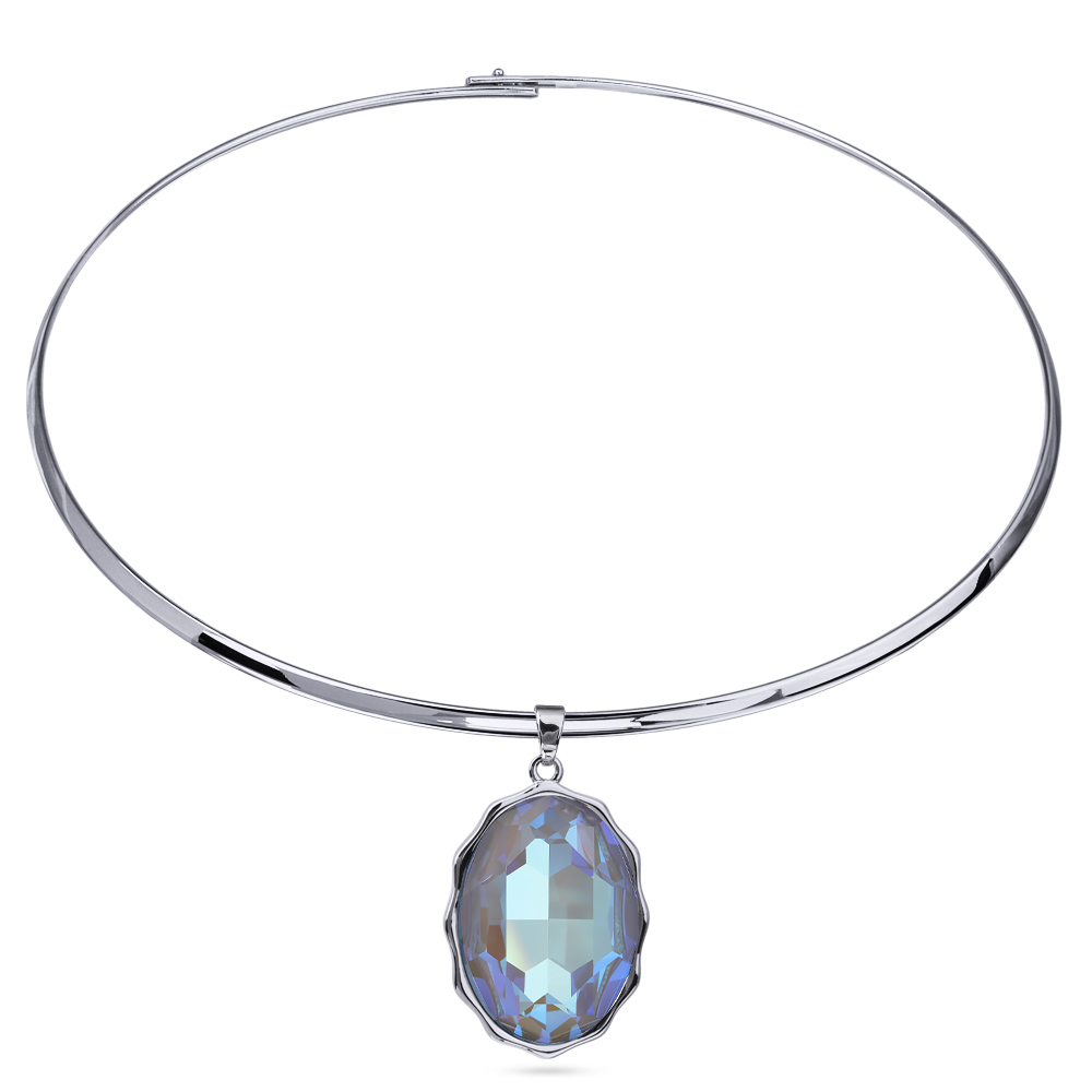Описание: Изготовлено из ювелирного сплава на основе латуни с гальваническим покрытием родием. Изделие украшают кристаллы SW серо-синего цвета. Длина колье 42см. Размер кулона 30х20мм.