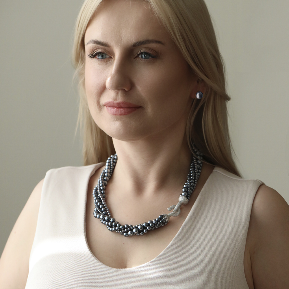 Описание: Изготовлено из ювелирного сплава на основе латуни с гальваническим покрытием родием. Изделие украшают темно-серый жемчуг Майорка диаметром 4-6мм и фианиты белого цвета. Длина колье 50см.