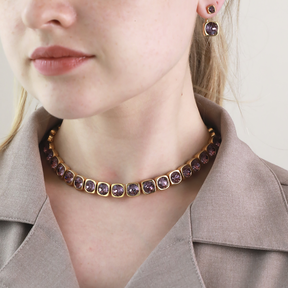 Описание: Изготовлено из ювелирного сплава на основе латуни с гальваническим покрытием золотом. Изделие украшают кристаллы SW аметистового цвета диаметром 8мм. Длина 37-40см.