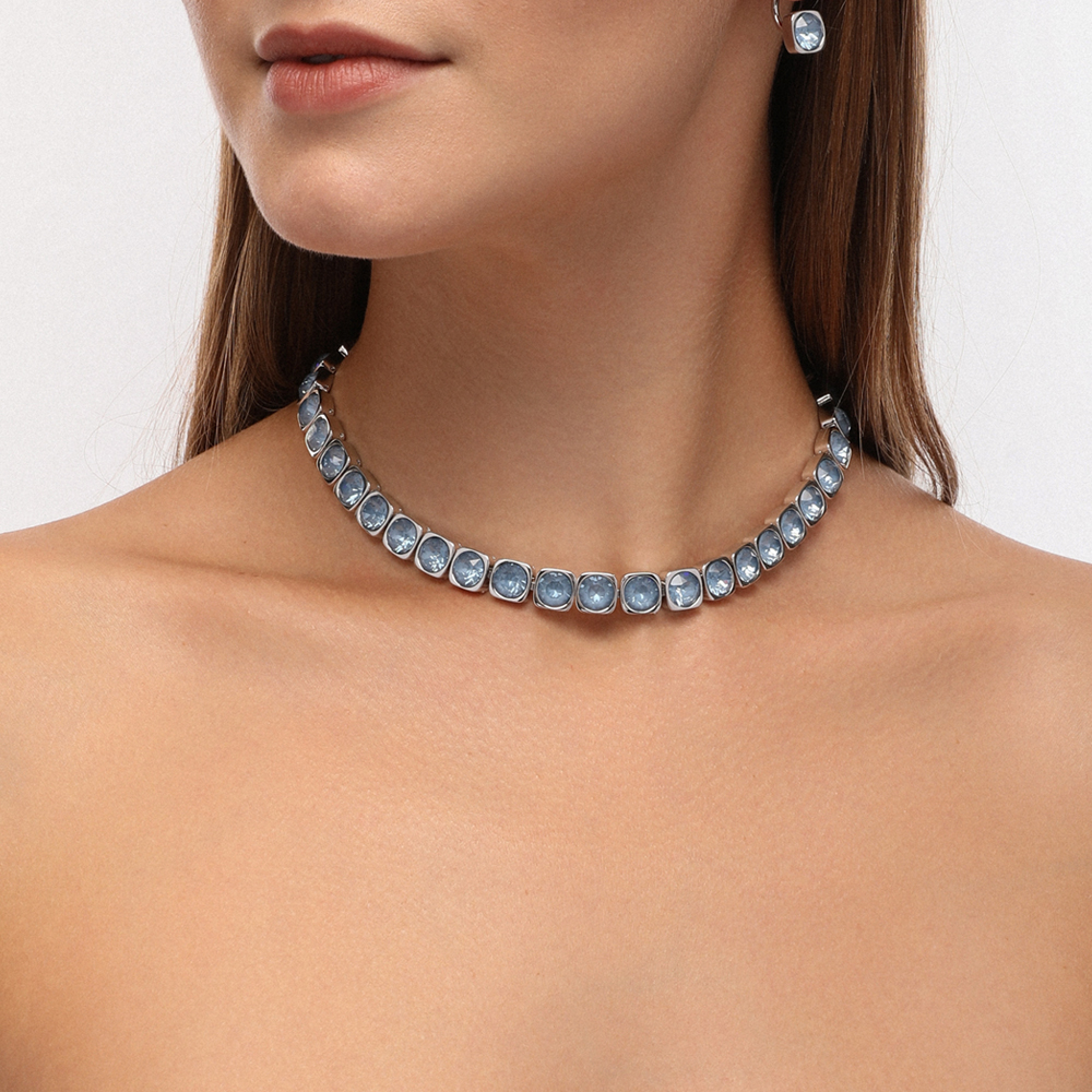 Описание: Изготовлено из ювелирного сплава на основе латуни с гальваническим покрытием родием. Изделие украшают кристаллы SW цвета байкальский лед диаметром 8мм. Длина 37-40см.