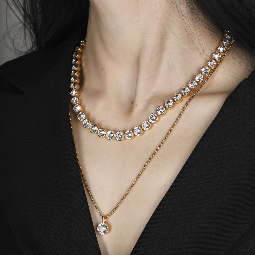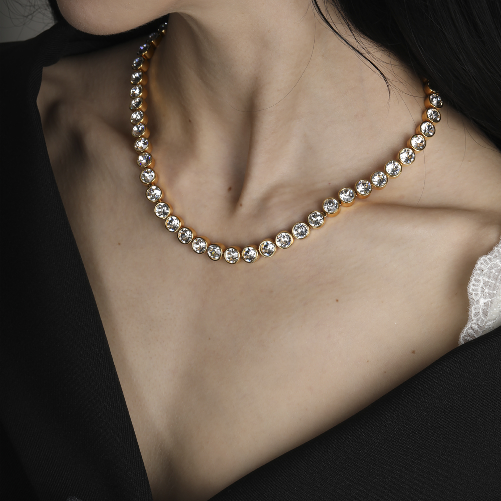 Описание: Изготовлено из ювелирного сплава на основе латуни с гальваническим покрытием золотом. Изделие украшают кристаллы SW белого цвета диаметром 6мм. Длина 44-49см.