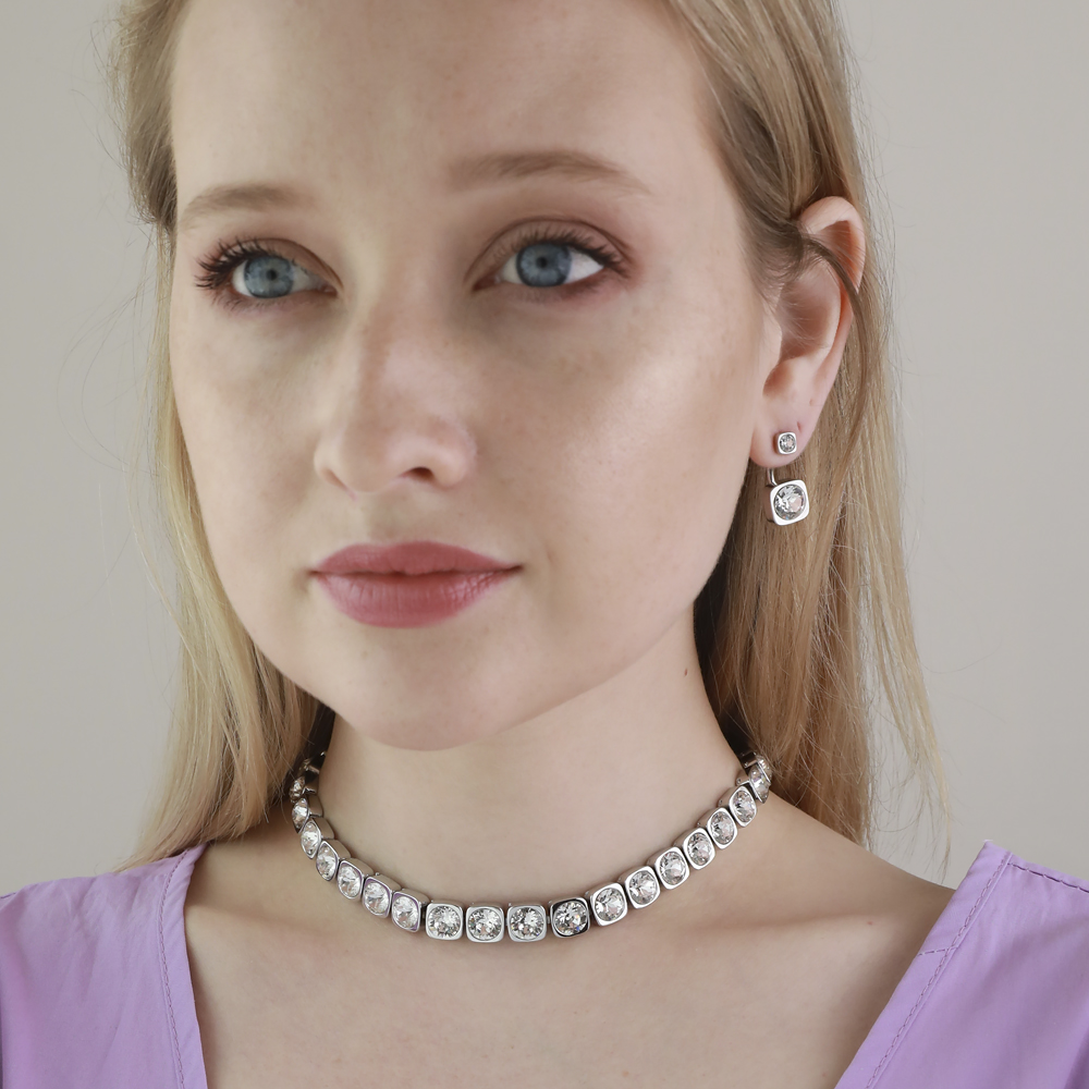 Описание: Изготовлено из ювелирного сплава на основе латуни с гальваническим покрытием родием. Изделие украшают кристаллы SW белого цвета диаметром 8мм. Длина 37-40см.