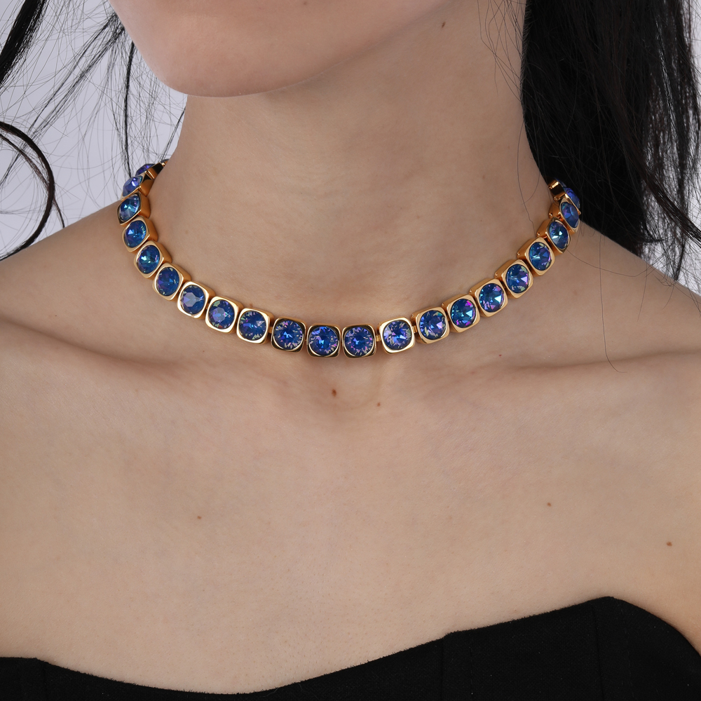 Описание: Изготовлено из ювелирного сплава на основе латуни с гальваническим покрытием золотом. Изделие украшают кристаллы SW королевского синего цвета диаметром 8мм. Длина 37-40см.