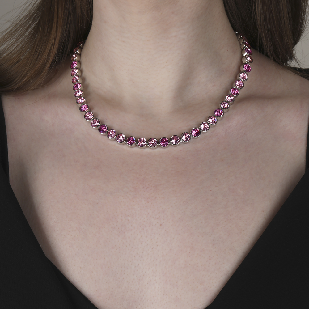 Описание: Изготовлено из ювелирного сплава на основе латуни с гальваническим покрытием родием. Изделие украшают кристаллы SW светло-розового и розового цвета диаметром 6мм. Длина 44-49см.