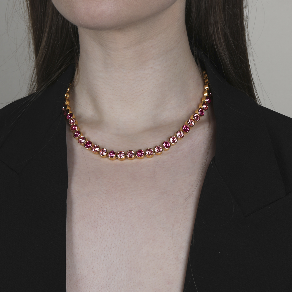 Описание: Изготовлено из ювелирного сплава на основе латуни с гальваническим покрытием золотом. Изделие украшают кристаллы SW светло-розового и розового цвета диаметром 6мм. Длина 44-49см.