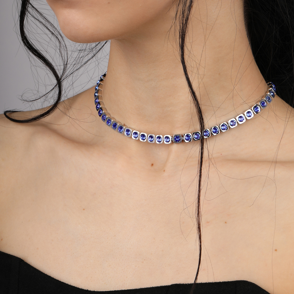 Описание: Изготовлено из ювелирного сплава на основе латуни с гальваническим покрытием родием. Изделие украшают кристаллы SW цвета сапфир диаметром 4мм. Длина 36-39см.