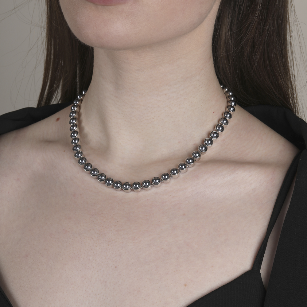 Описание: Изготовлено из ювелирного сплава на основе латуни с гальваническим покрытием родием. Изделие украшает жемчуг Майорка диаметром 6мм темно-серого цвета. Длина 44-49см.