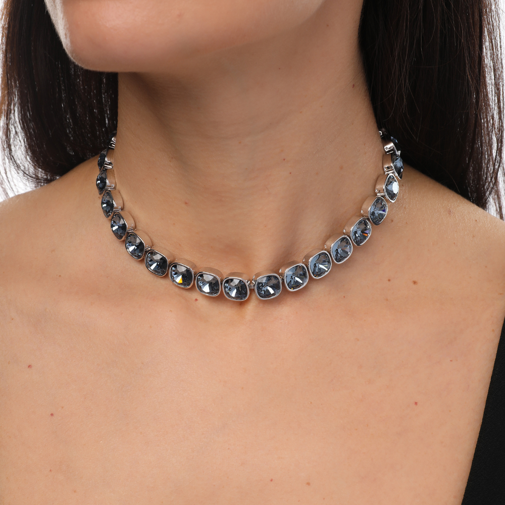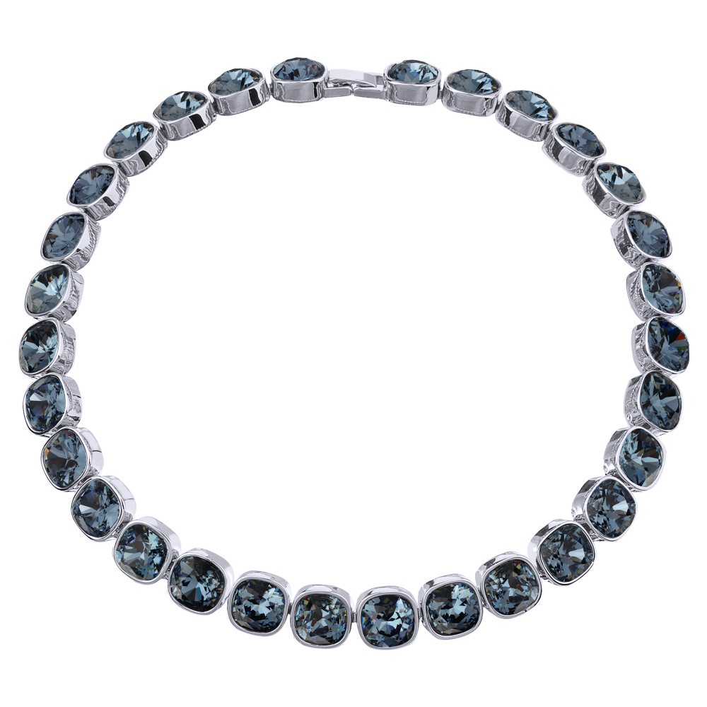 Описание: Изготовлено из ювелирного сплава на основе латуни с гальваническим покрытием родием. Изделие украшают кристаллы SW цвета джинс диаметром 10мм. Длина 38-42см.