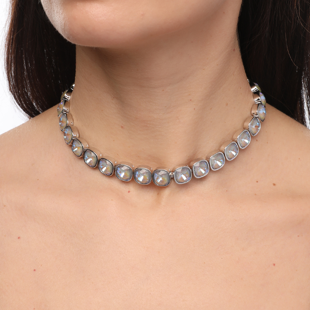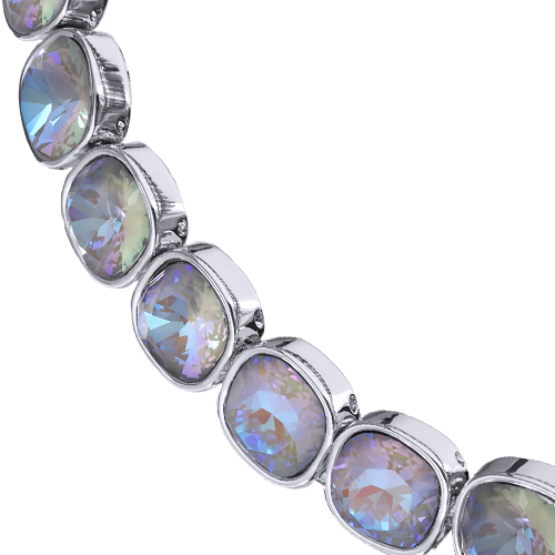 Описание: Изготовлено из ювелирного сплава на основе латуни с гальваническим покрытием родием. Изделие украшают кристаллы SW серо-синего цвета диаметром 10мм. Длина 38-42см.