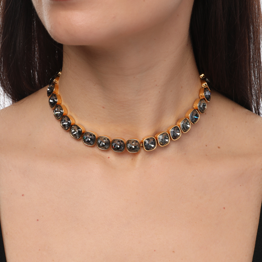 Описание: Изготовлено из ювелирного сплава на основе латуни с гальваническим покрытием золотом. Изделие украшают кристаллы SW серого микс цвета диаметром 10мм. Длина 38-42см.