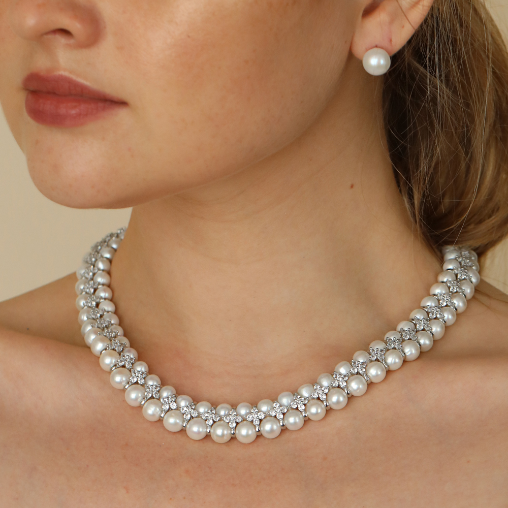 Описание: Изготовлено из ювелирного сплава на основе латуни с гальваническим покрытием родием. Изделие украшают жемчуг Майорка диаметром 7мм и белый фианит Длина колье 45см.