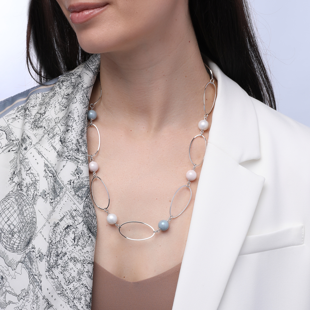 Описание: Изготовлено из ювелирного сплава на основе латуни с гальваническим покрытием родием. Изделие украшает майорский круглый жемчуг белого, холодно-розового и голубого цвета диаметром 12мм. Длина колье 55см. Замок — карабин с удлинителем 5см.