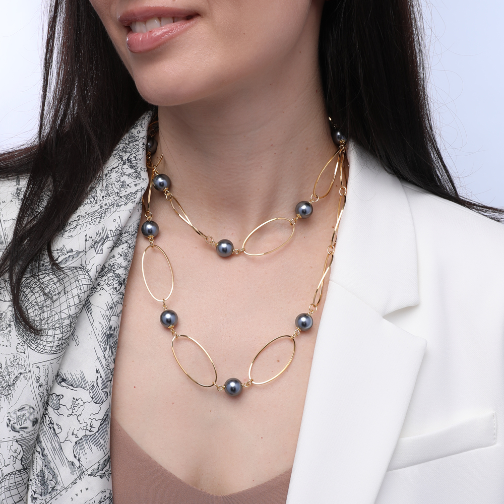 Колье Воздух (Майорка темно-серая 12мм; покрытие золото) 100см