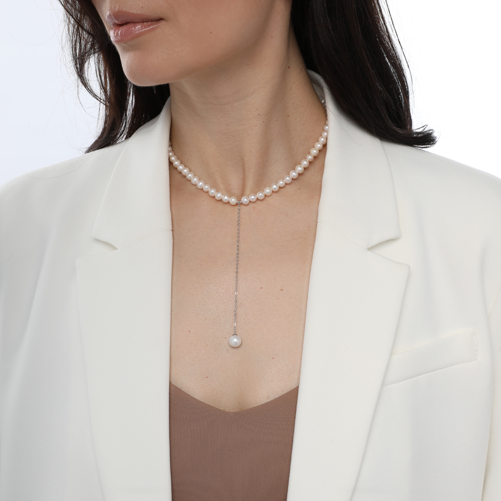 Описание: Изготовлено из ювелирного сплава на основе латуни с гальваническим покрытием родием. Изделие украшает жемчуг диаметром 5-9мм белого цвета. Длина колье 38-45см.