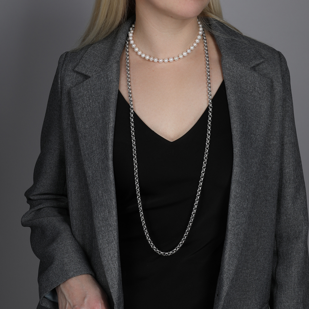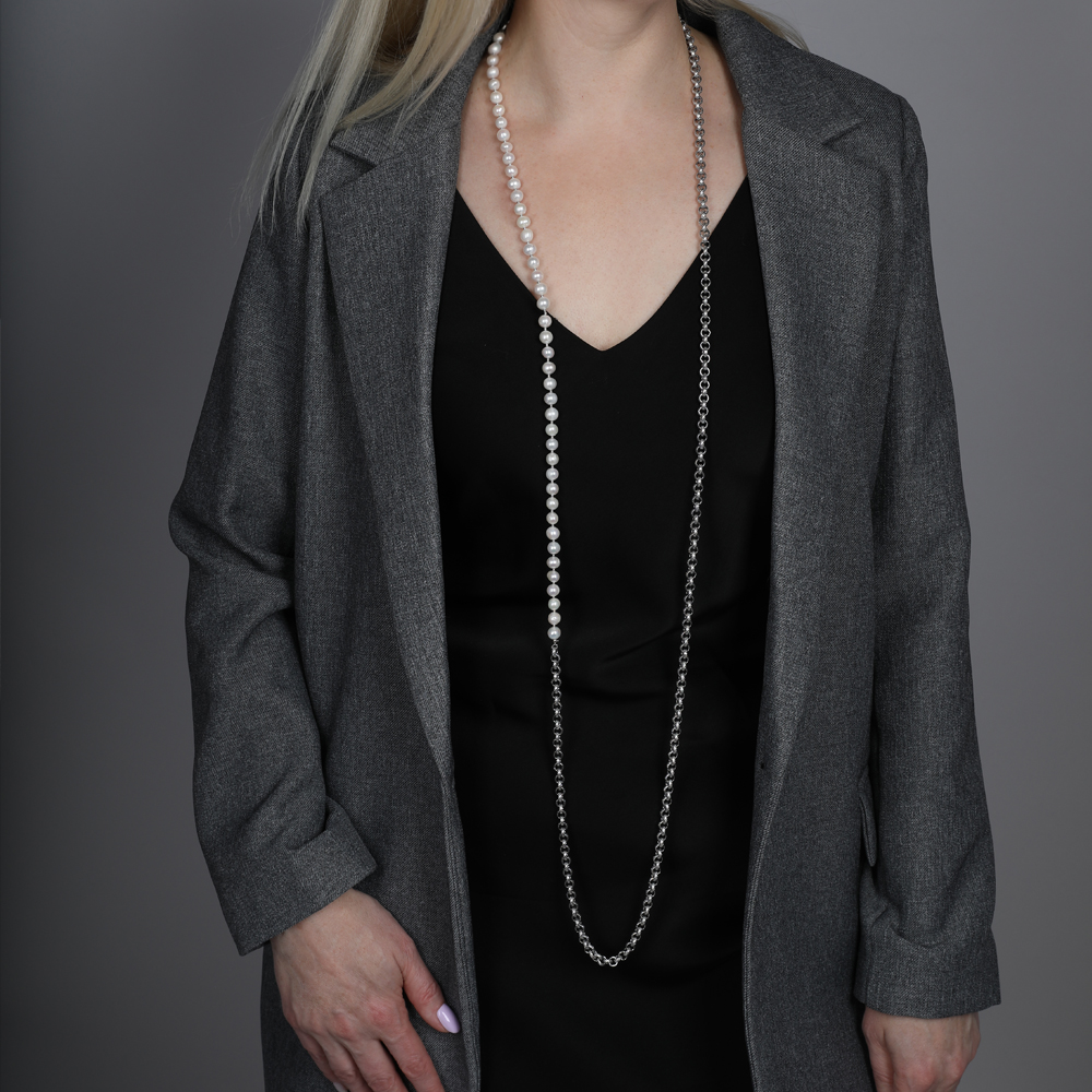 Описание: Изготовлено из ювелирного сплава на основе латуни с гальваническим покрытием родием. Изделие украшает натуральный жемчуг диаметром 6мм белого цвета. Длина 140см.