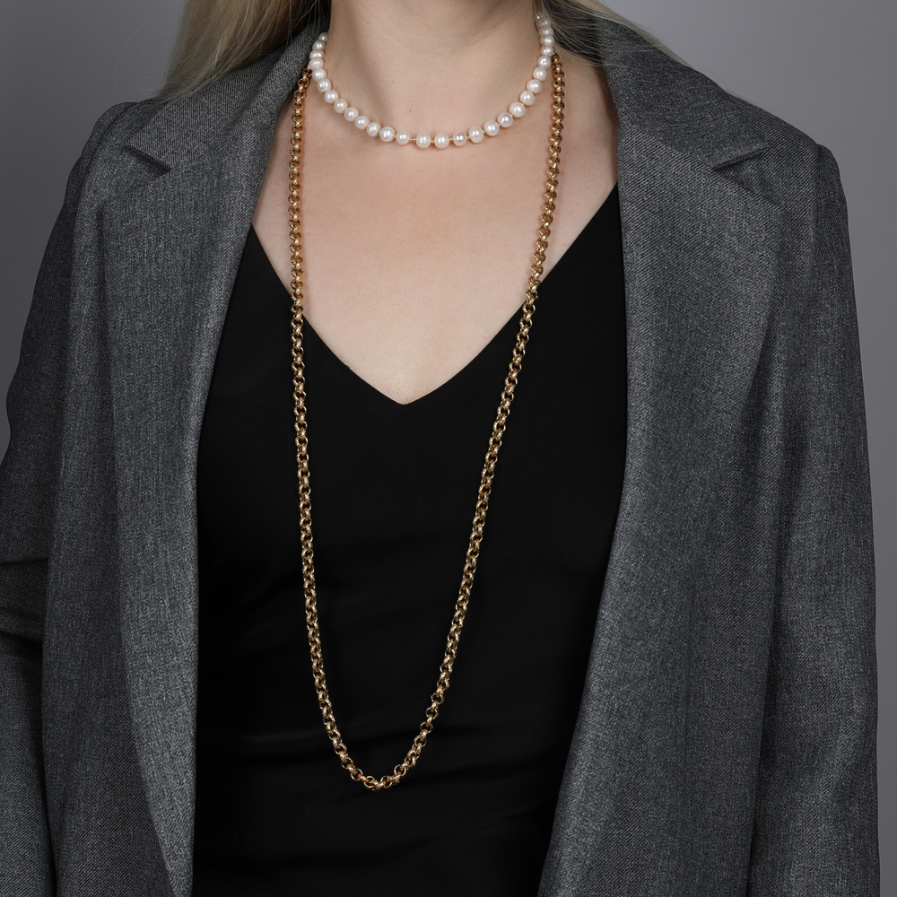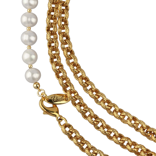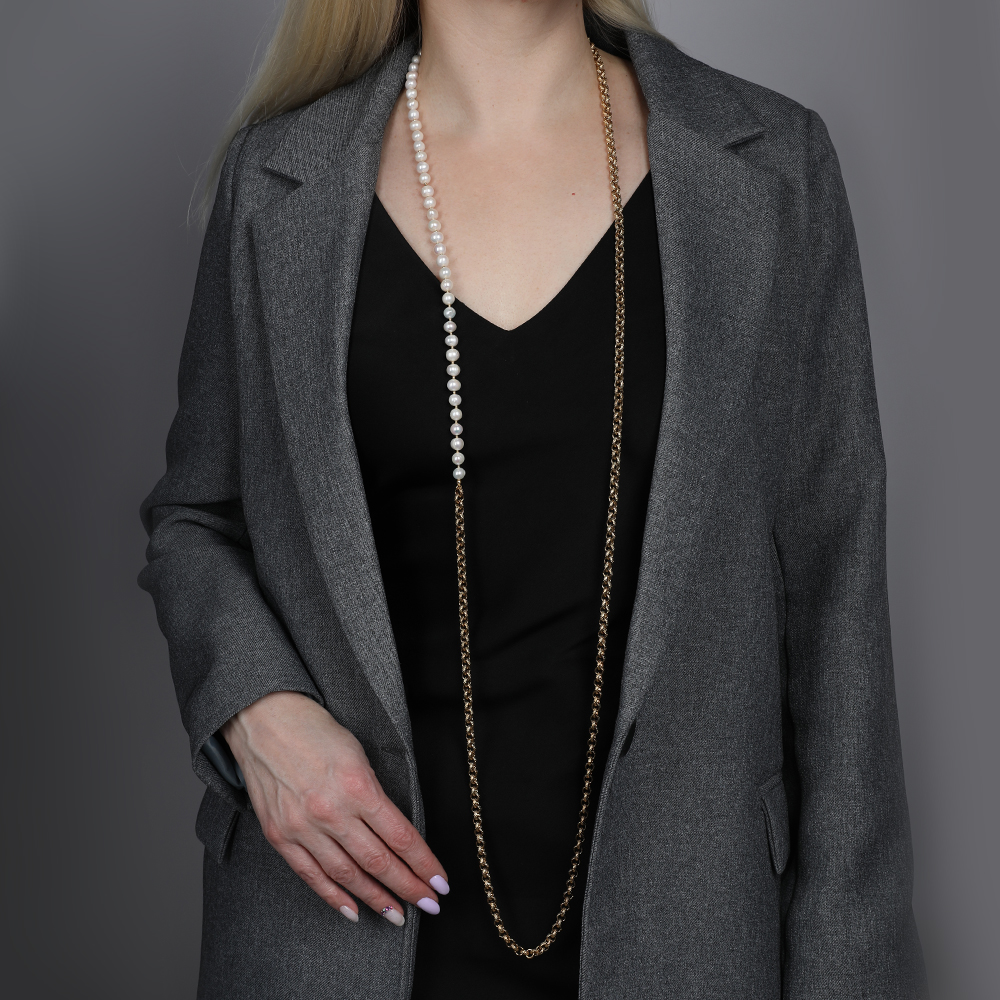 Описание: Изготовлено из ювелирного сплава на основе латуни с гальваническим покрытием золотом. Изделие украшает натуральный жемчуг диаметром 6мм белого цвета. Длина 140см.