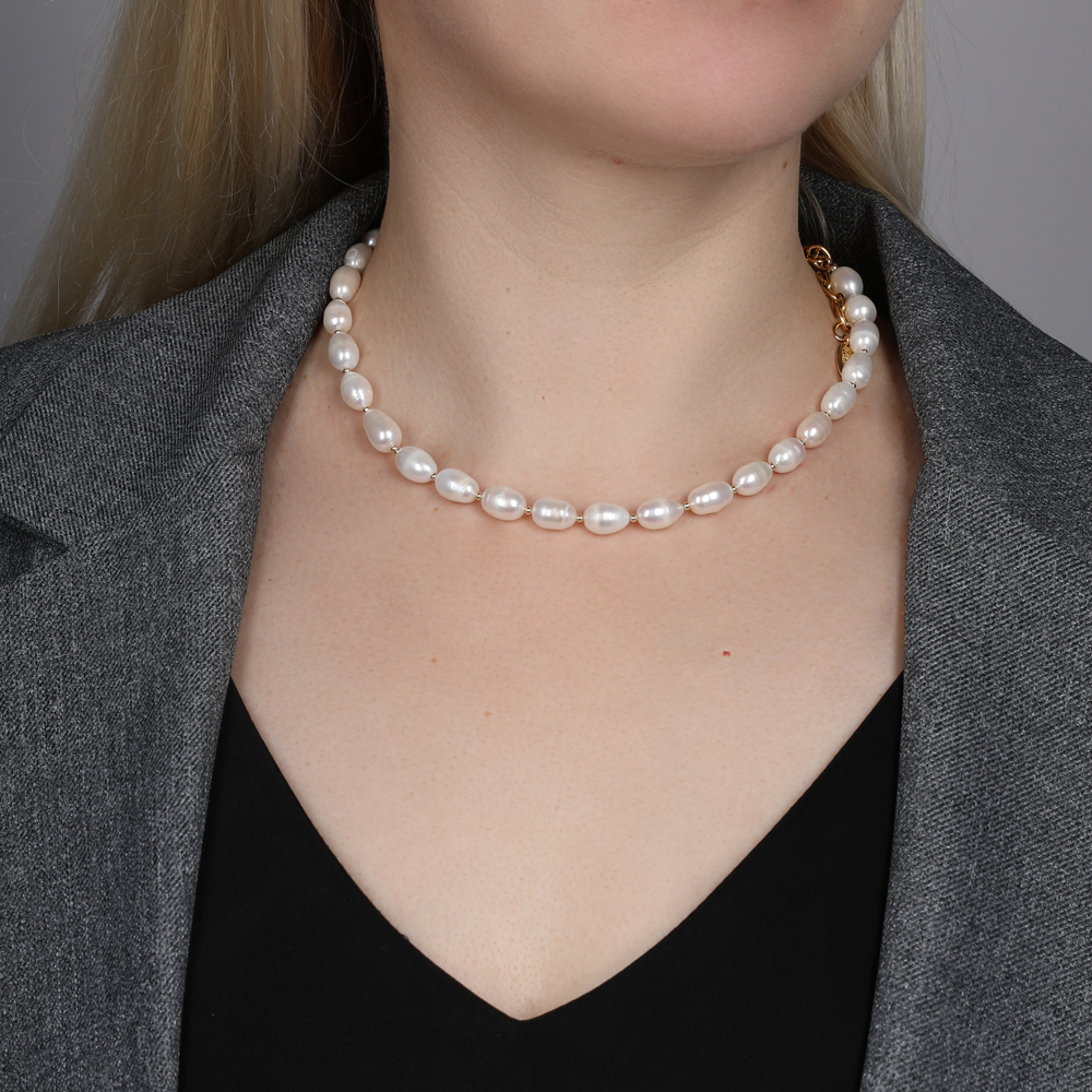 Описание: Изготовлено из ювелирного сплава на основе латуни с гальваническим покрытием золотом. Изделие украшает натуральный жемчуг диаметром 6мм белого цвета. Длина 44см. Удлинитель 5см.