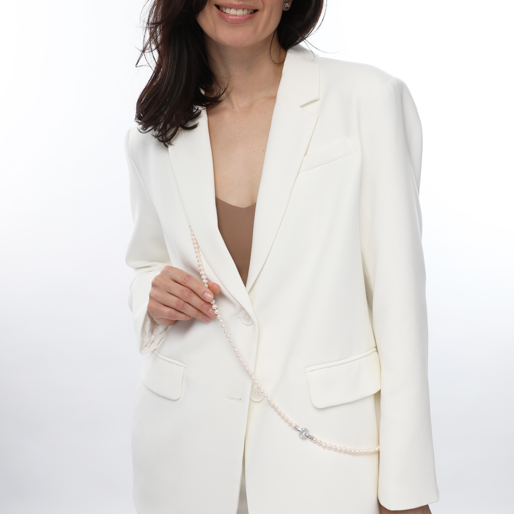 Описание: Изготовлено из ювелирного сплава на основе латуни с гальваническим покрытием родием. Колье выполнено из натурального белого жемчуга высшего качества диаметром 7-8мм и украшено декоративным замком из фианита белого цвета. Длина 160см.