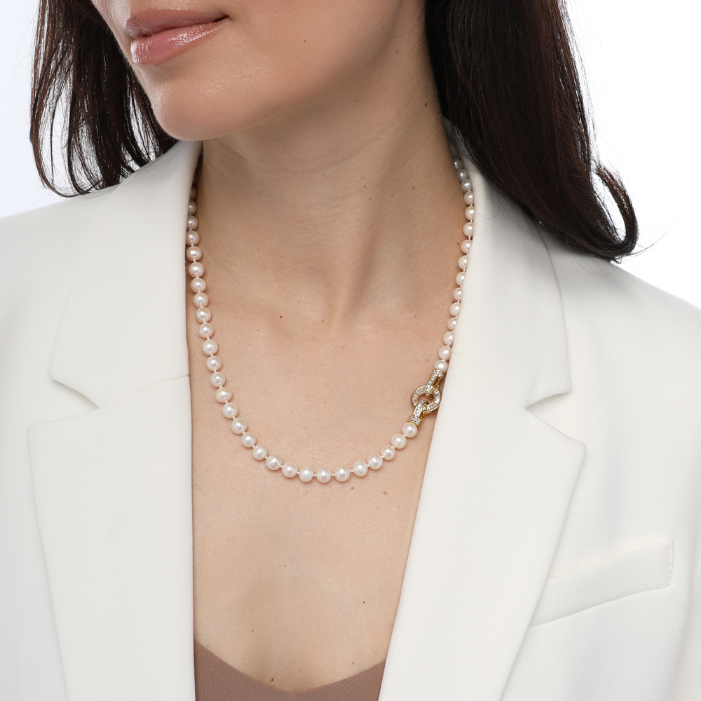 Описание: Изготовлено из ювелирного сплава на основе латуни с гальваническим покрытием золотом. Колье выполнено из натурального белого жемчуга высшего качества диаметром 7-8мм и украшено декоративным замком из фианита белого цвета. Длина 50см.