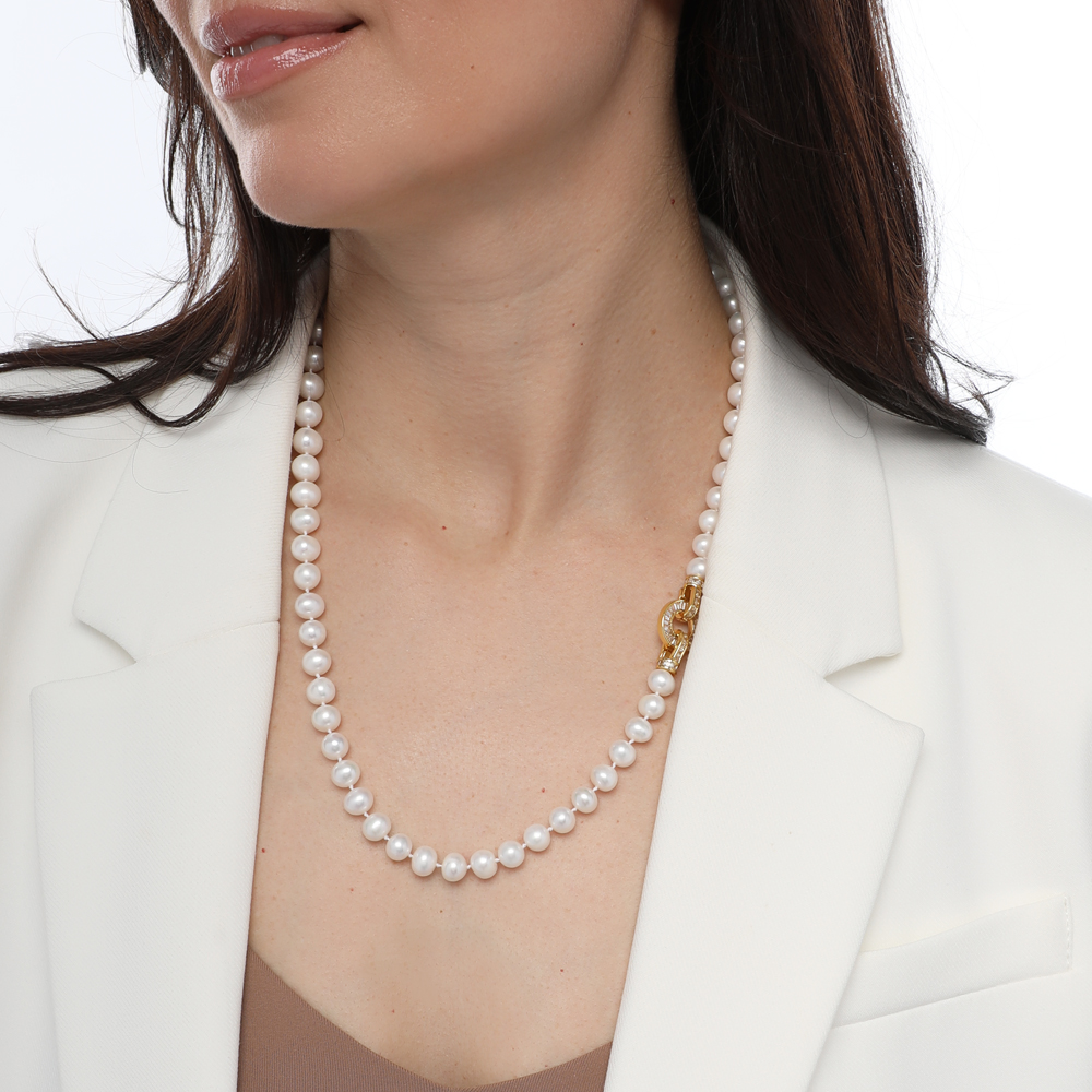 Описание: Изготовлено из ювелирного сплава на основе латуни с гальваническим покрытием золотом. Колье выполнено из натурального белого жемчуга высшего качества диаметром 8-9мм и украшено декоративным замком из фианитов белого цвета. Длина 55см.