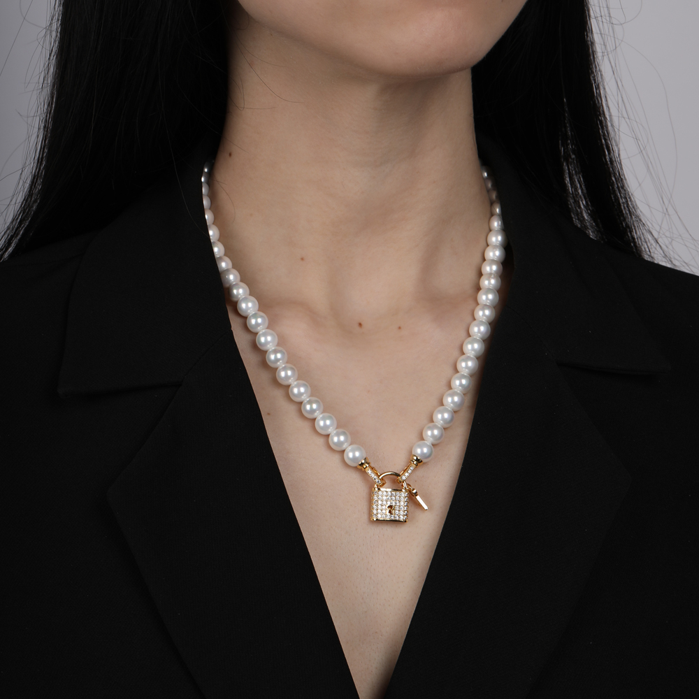 Описание: Изготовлено из ювелирного сплава на основе латуни с гальваническим покрытием золотом. Изделие украшают жемчуг диаметром 8мм и белый фианит Длина колье 45см.