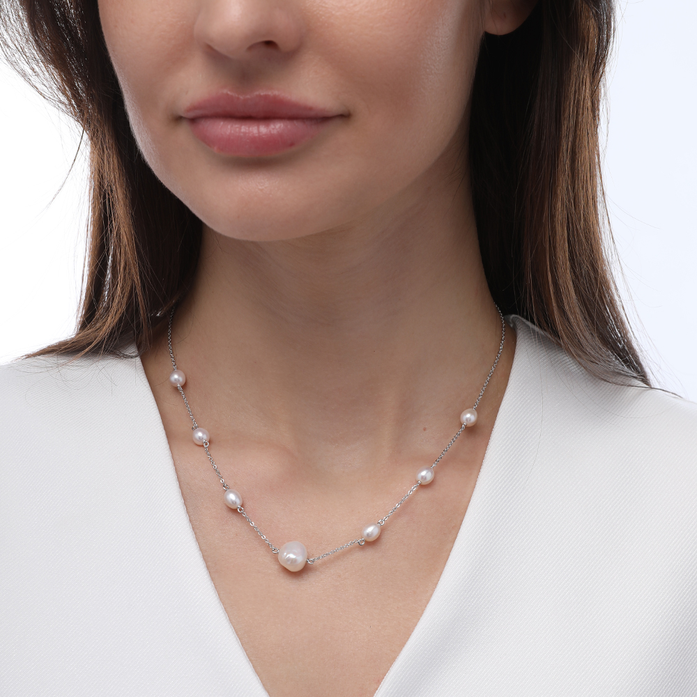 Описание: Изготовлено из ювелирного сплава на основе латуни с гальваническим покрытием родием. Изделие украшают жемчуг и белый фианит Длина 36см. Замок-карабин с удлинителем 5см.